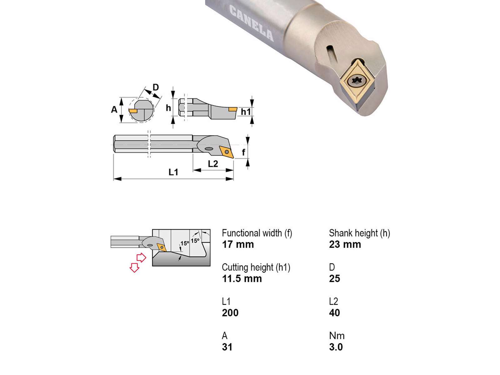 • Canela A25R-SDQCL11 udborestål er ideelt til præcise udboringsopgaver. Med en robust konstruktion og en integreret kølekanal sikrer det optimal ydeevne og længere levetid. Det er velegnet til både industrielle og professionelle anvendelser, og sikrer præcision ved venstreindgreb.