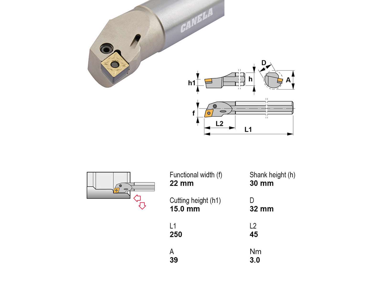 Canela A32S-PCLNR12 er et robust udborestål, designet til præcisionsarbejde. Med en skaftdiameter på 32 mm, en totallængde på 250 mm og en skærediameter på 39 mm, sikrer det stabilitet og høj ydeevne. Udstyret med kølekanal for optimal temperaturstyring under skæring.