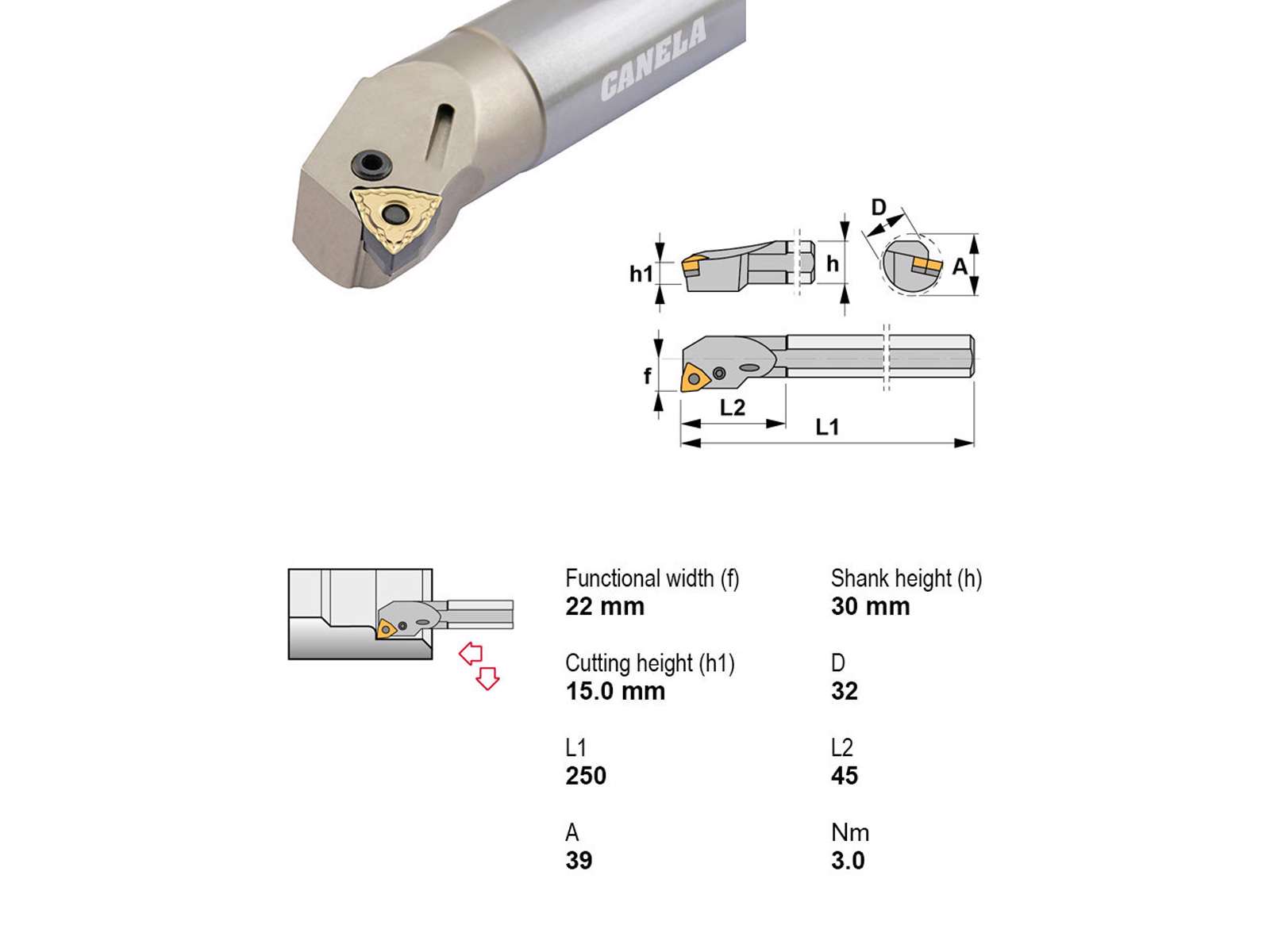 Canela A32S-PWLNR08 er et præcisionsudborestål designet til professionel bearbejdning. Med en robust Ø32 mm skaft og integreret kølekanal, sikrer det effektiv varmehåndtering under drift. Stålet er kompatibelt med plattetyper WNM..0804.. og har en højreindgreb for præcis skæring.