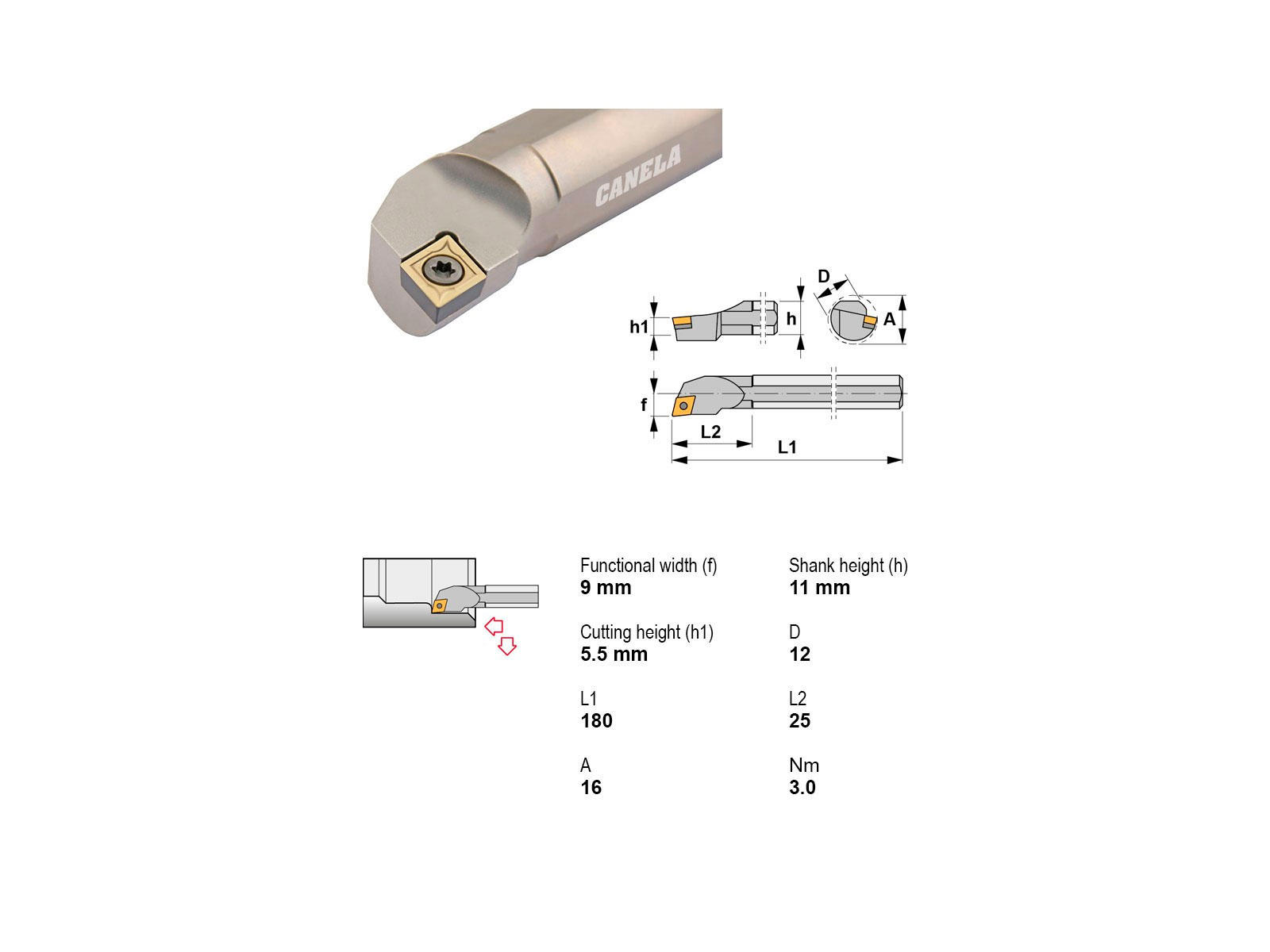 Canela udborestål S12Q-SCLCR09 er designet til præcisionsbearbejdning i høj kvalitet. Det kompakte design med høj ydeevne gør det ideelt til krævende opgaver i metalbearbejdning. Velegnet til CC..09T3.. platte.