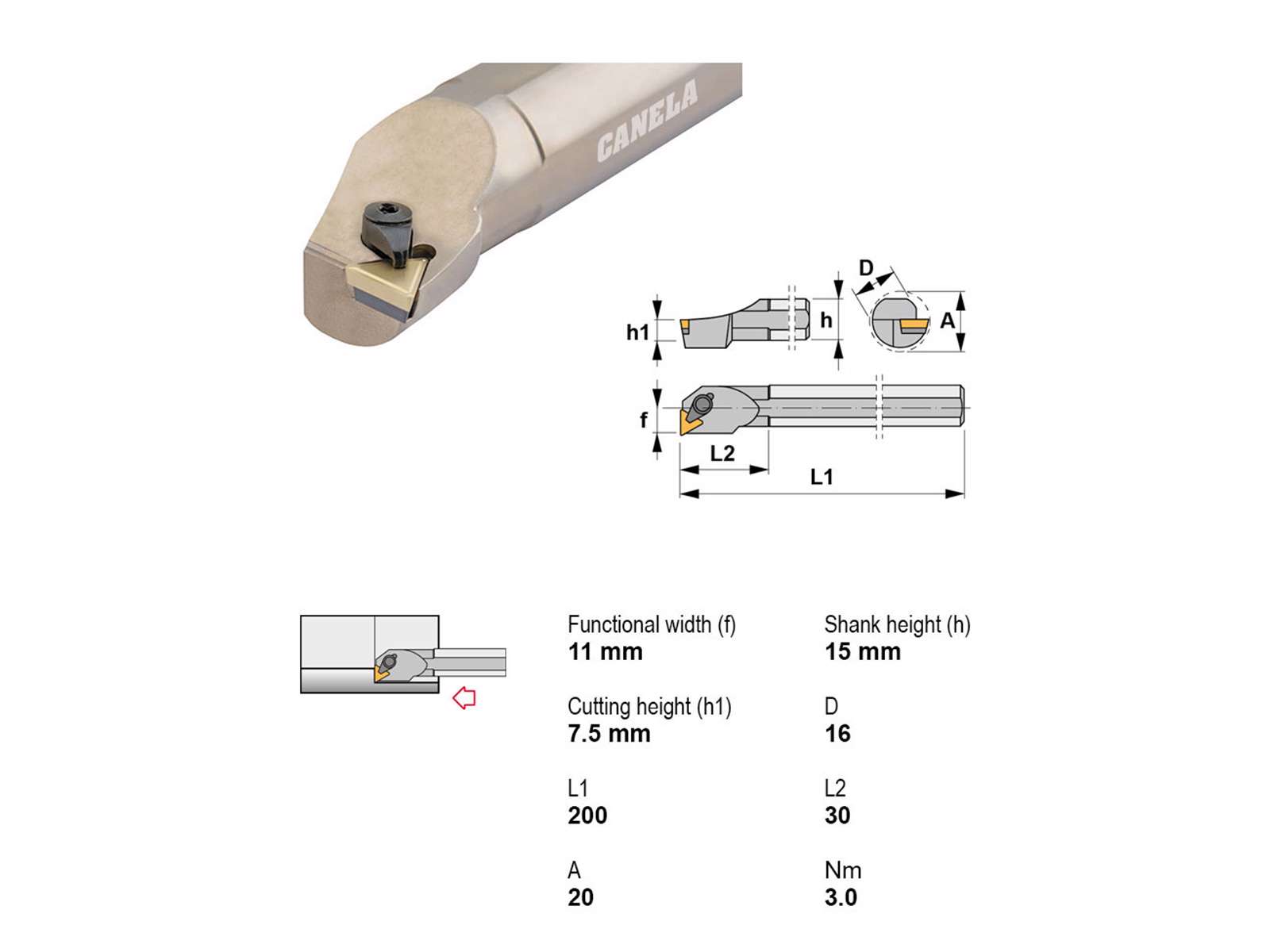 • Canela S16R-CTFPR16 udborestål er et præcisionsværktøj designet til effektiv indvendig boring. Med en robust Ø16 mm skaft og en skærediameter på Ø20 mm sikrer den høj stabilitet og nøjagtighed. Værktøjet anvender TP..1603.. skær og har en hovedlængde på 30 mm, hvilket gør det velegnet til krævende bearbejdningsopgaver.