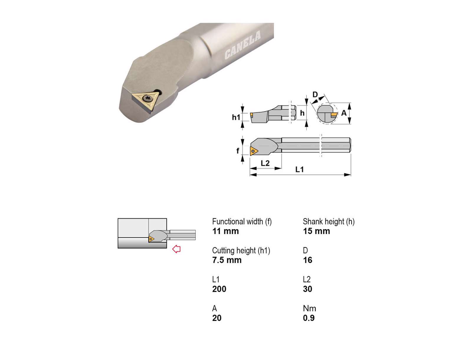 • Canela S16R-STFCR11 er et robust udborestål designet til præcisionsbearbejdning. Med en længde på 200 mm og et Ø16 mm skaft sikrer den stabilitet og præcision ved indvendig drejning. Skærehovedet har en længde på 30 mm og understøtter TC..1102.. skærplatter, hvilket giver alsidighed i materialebearbejdning. Med en skærediameter på Ø20 mm og højrehåndsindgreb er dette værktøj ideelt til præcisionsopgaver uden køling.