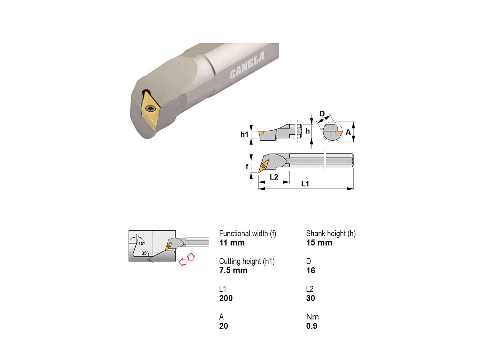 • Canela udborestål S16R-SVQCR11 er et præcist og robust værktøj til drejeopgaver med høj præcision. Det har en længde på 200 mm og et Ø16 mm skaft, hvilket sikrer stabilitet under bearbejdning. Med en skærediameter på Ø20 mm og understøttelse af VCMT1103-platter, leverer det optimal skæreevne.