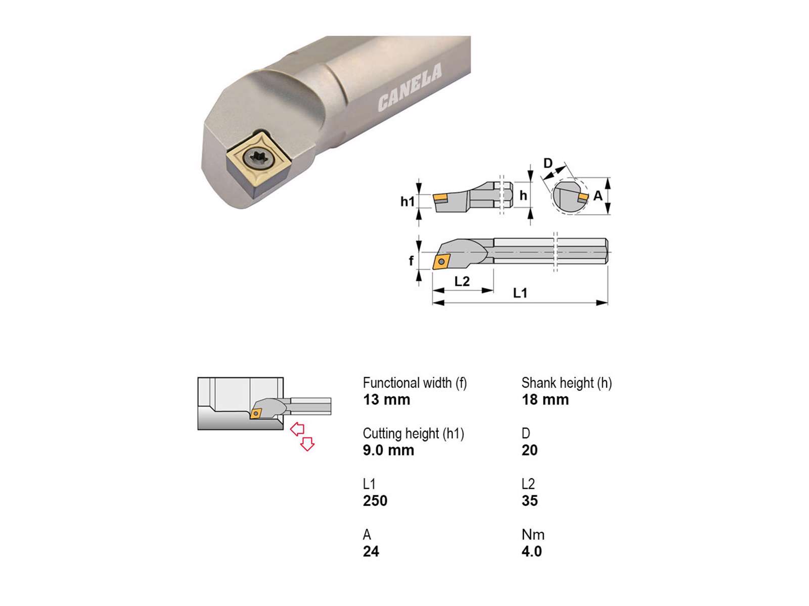 Canela S20S-SCLCR12 er et robust udborestål med Ø20 mm skaft, der sikrer stabil og præcis bearbejdning. Velegnet til brug uden køling og kompatibelt med CC..1204.. platte.