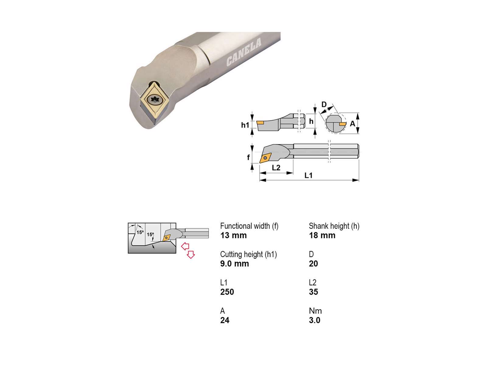 • Canela S20S-SDQCR11 er et robust udborestål designet til præcisionsopgaver i metalbearbejdning. Med en længde på 250 mm og et skaft på Ø20 mm sikrer det stabilitet og præcis styring under bearbejdningen. Hovedets længde på 35 mm og diameter på 24 mm gør værktøjet velegnet til opgaver, der kræver nøjagtig boring og høj repeterbarhed. Det anvender DC..11T3.. platte og er optimeret til højreindgreb uden køling, hvilket gør det velegnet til tørbearbejdning af passende materialer.