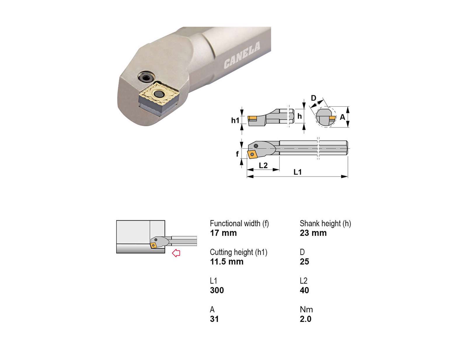 Canela S25T-PCKNR12 er et robust udborestål med Ø25 mm skaft og højre indgreb, kompatibelt med CN..1204.. platte. Uden køling og med en længde på 300 mm sikrer det præcis og stabil bearbejdning i krævende applikationer.