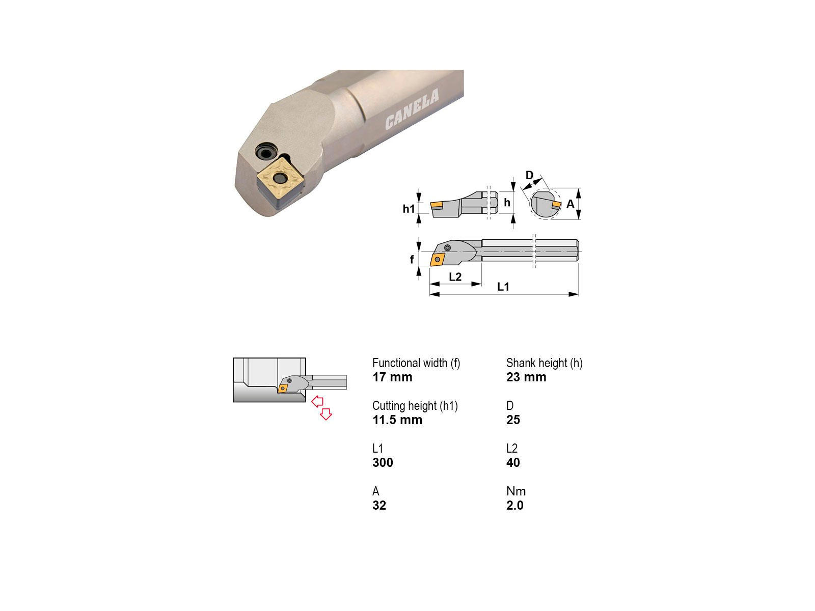 Canela S25T-PCLNR09 er et robust udborestål med Ø25 mm skaft og en samlet længde på 300 mm. Det sikrer effektiv og stabil boring uden køling og passer til CNM..0903.. platte for højre indgreb.