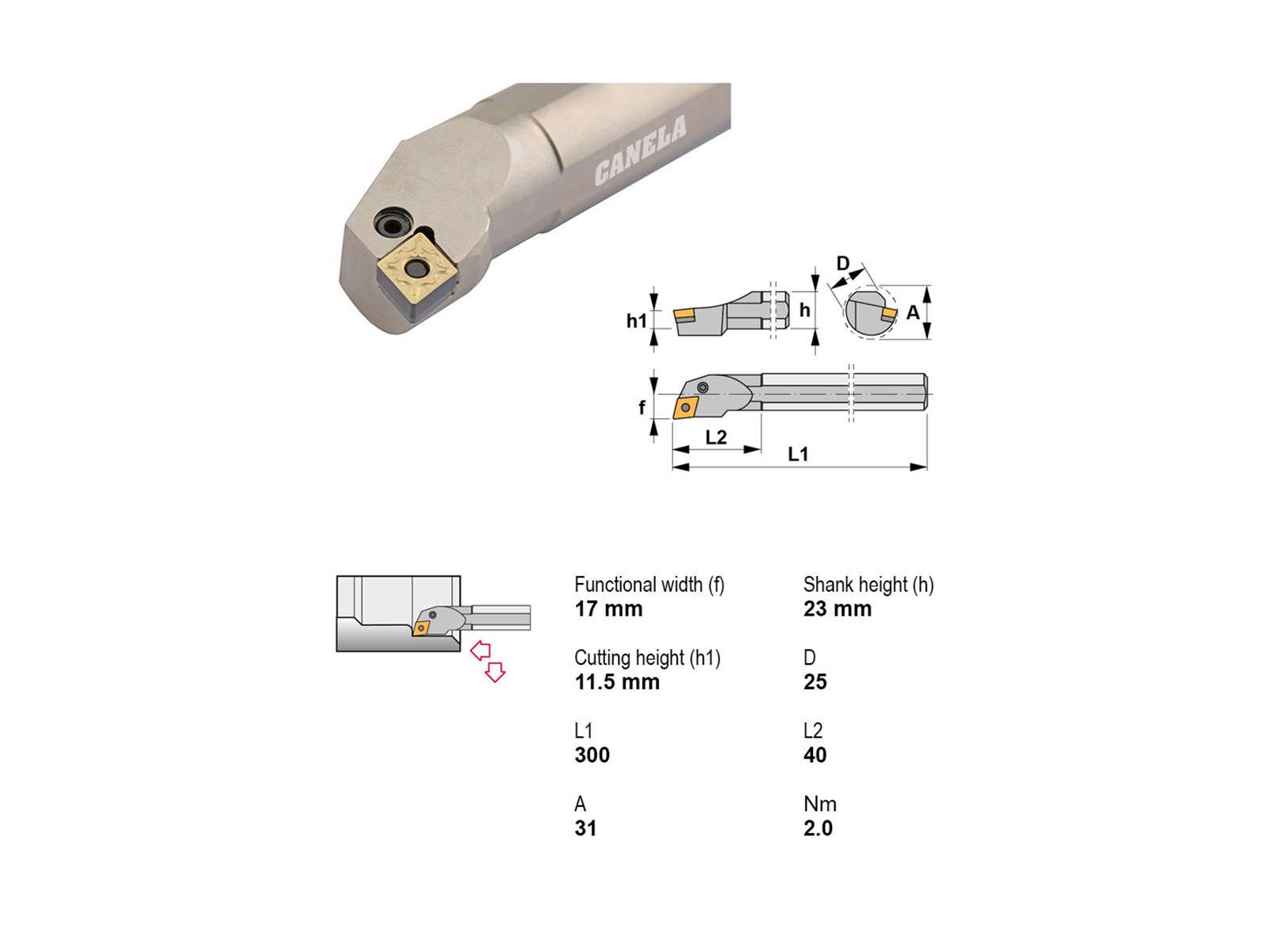 Canela S25T-PCLNR12 er et robust udborestål med 25 mm skaftdiameter og 300 mm længde. Værktøjet er kompatibelt med CN..1204.. platte og har højre indgreb, hvilket gør det velegnet til præcis intern drejning uden køling.