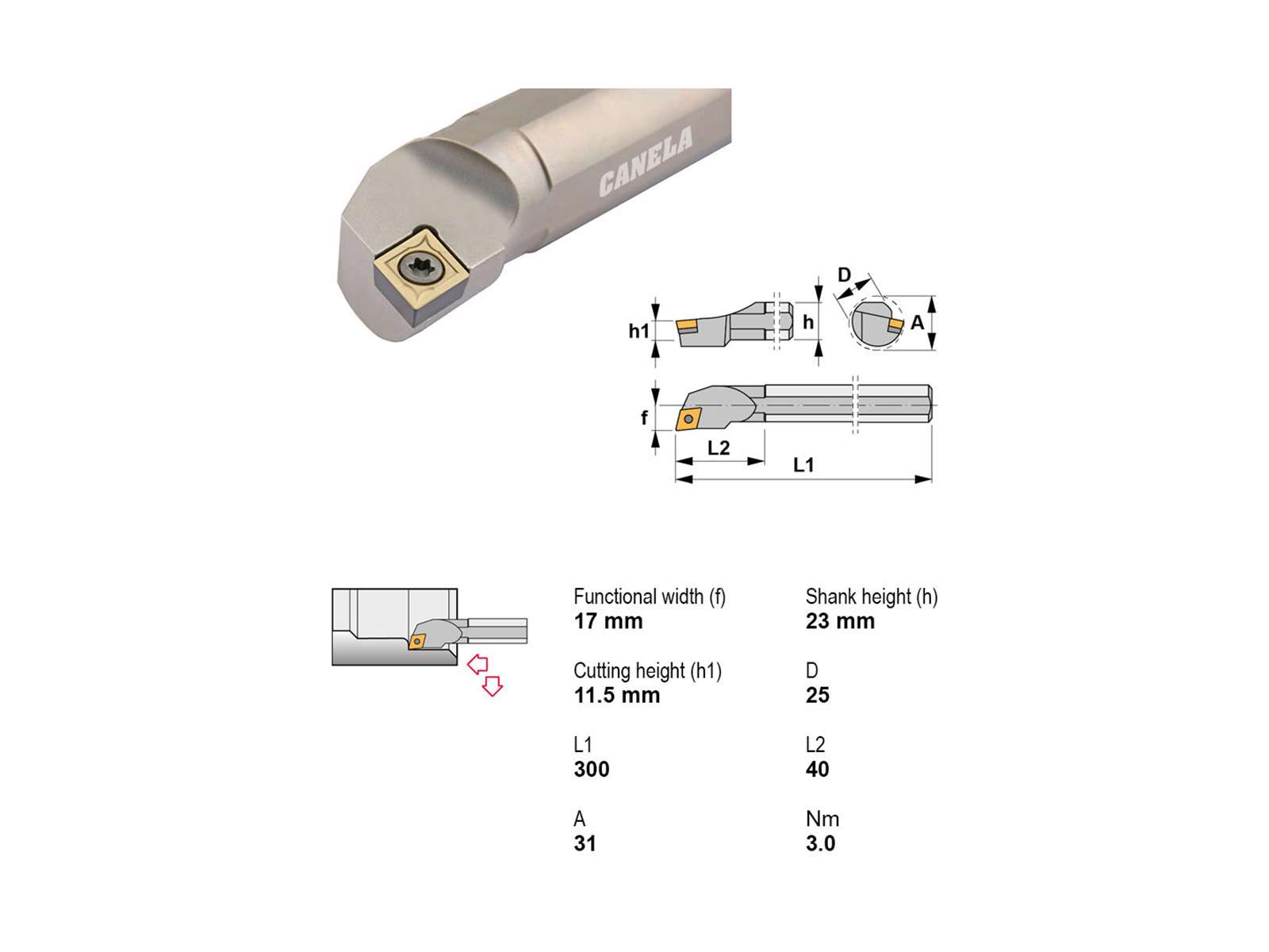 Canela S25T-SCLCR09 er et robust udborestål med Ø25 mm skaft og en længde på 300 mm, egnet til brug med CC..0903.. vendeskær. Værktøjet er højrevendt og uden køling, hvilket gør det velegnet til konventionel indvendig drejning i materialer, hvor ekstern køling ikke er påkrævet.