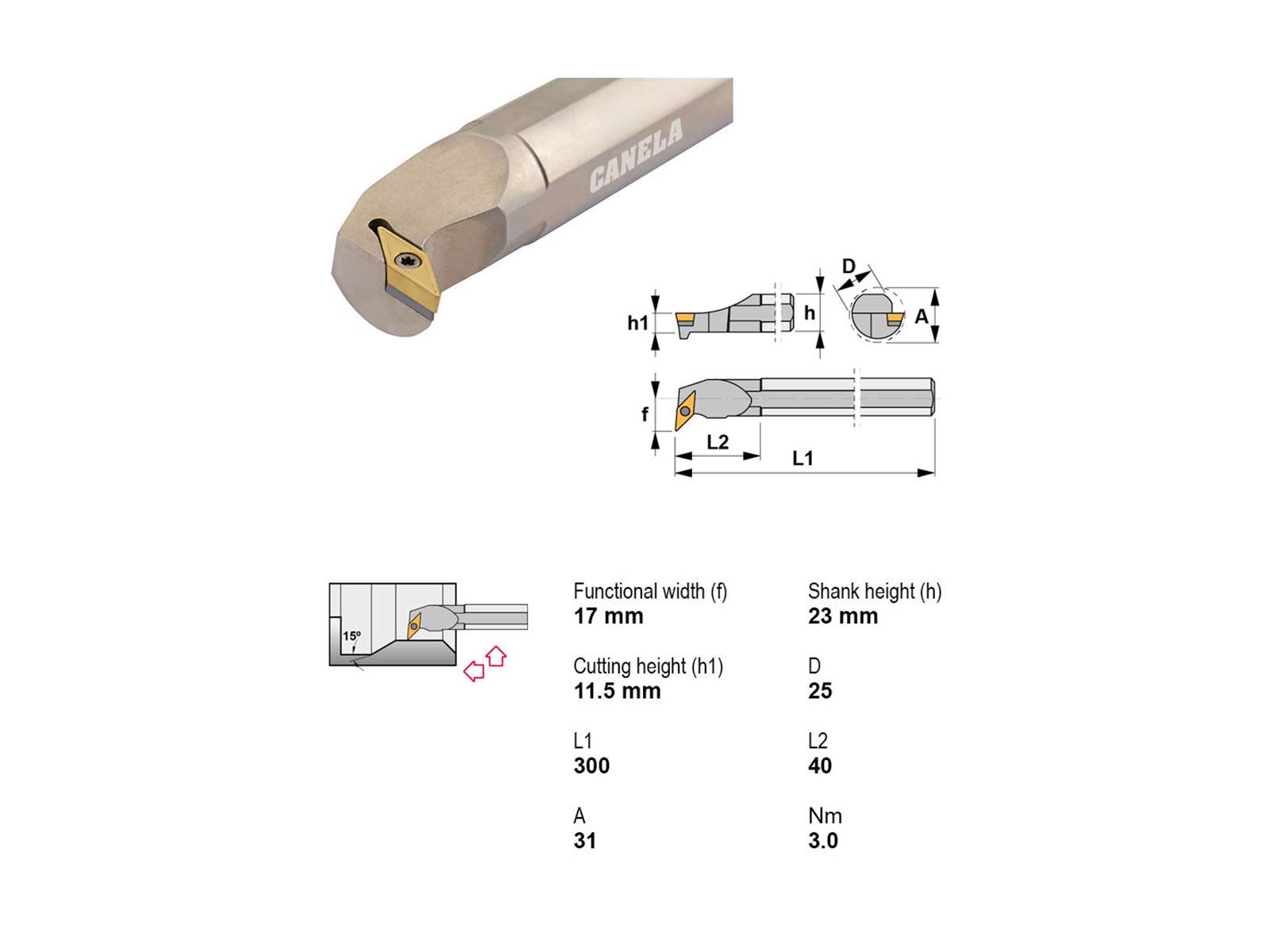 Canela S25T-SVUBR16 er et robust udborestål med 25 mm skaft og 300 mm længde, velegnet til højreindgreb og intern drejning. Værktøjet anvender VBMT1604-skær og leverer stabilitet ved bearbejdning uden køling.