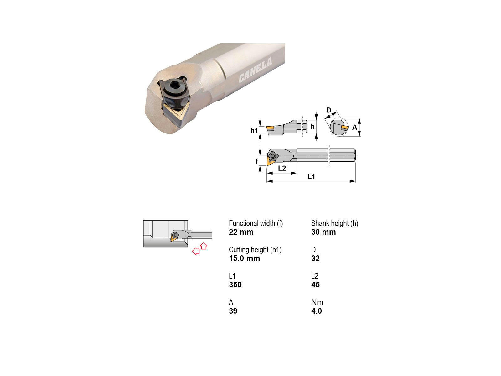 Canela S32U-MTUNR16 er et robust udborestål med Ø32 mm skaft og højre indgreb, konstrueret til brug med TNM..1604.. vendeskær. Værktøjet har en længde på 350 mm og en skærediameter på 39 mm, hvilket sikrer stabil og præcis bearbejdning ved indvendig drejning uden køling.