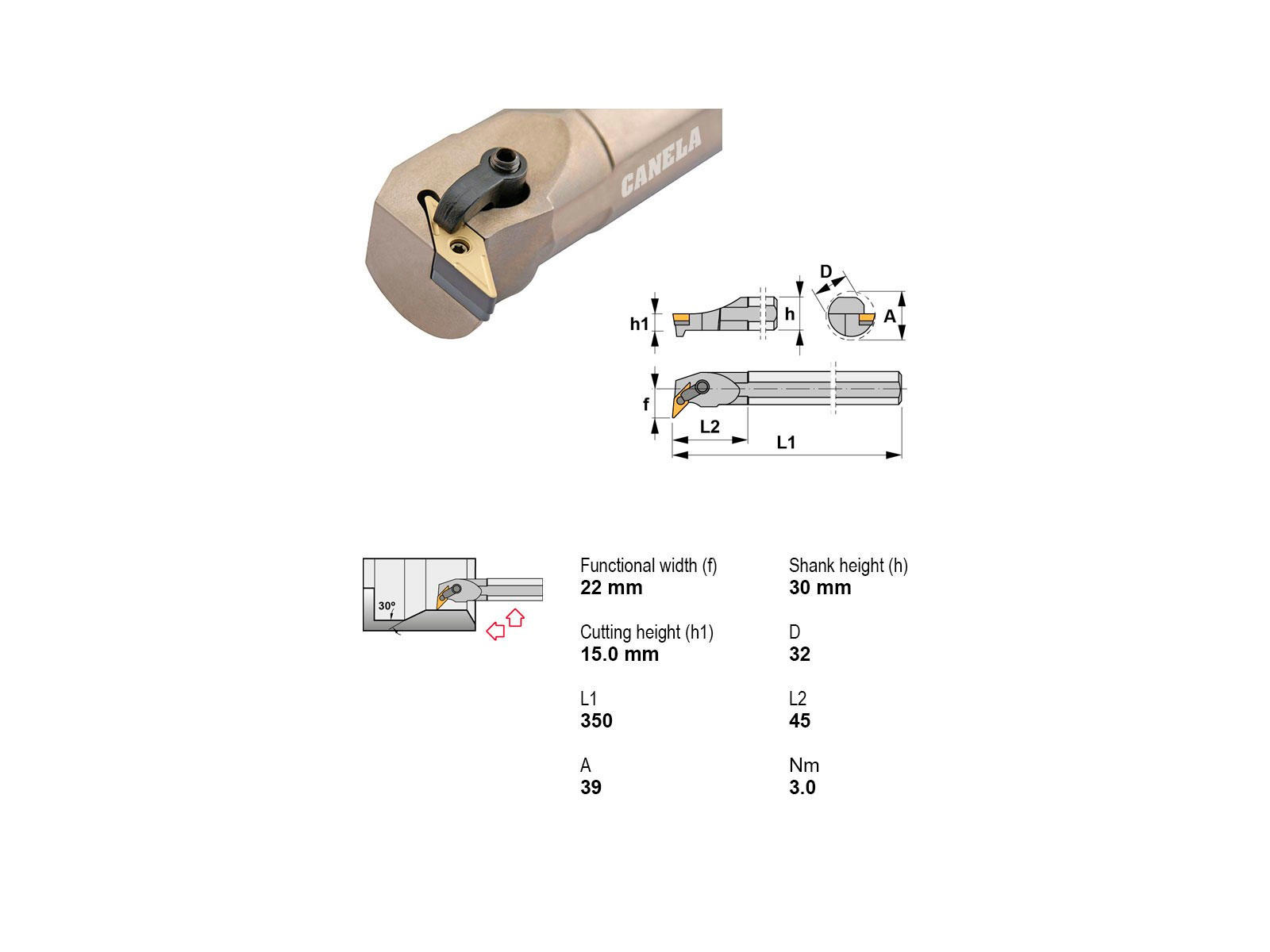 • Canela S32U-MVUNR 16-K er et robust udborestål med 32 mm skaft og 350 mm længde, designet til effektiv intern drejning i højre indgreb. Den anvender VN..1604.. skærplatter og er velegnet til præcisionsopgaver uden behov for køling.