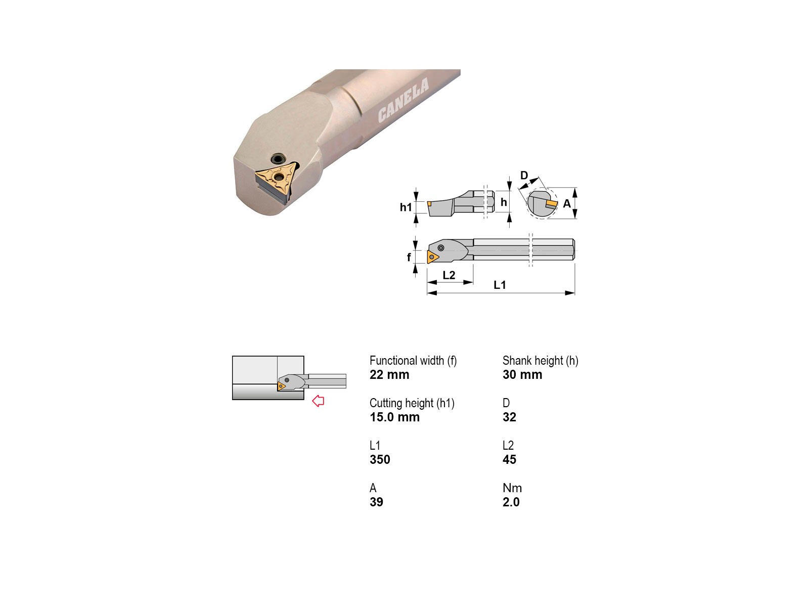 • Canela S32U-PTFNR16 er et robust udborestål med Ø32 mm skaft og 350 mm længde, velegnet til præcis indvendig bearbejdning. Stålet er kompatibelt med TN..1604.. vendeskær og har højre indgreb uden køling, hvilket gør det velegnet til tørbearbejdning i forskellige materialer.