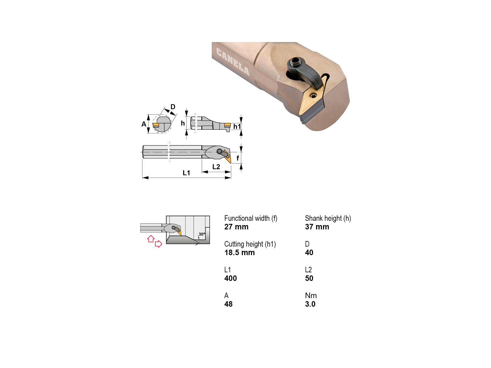 Canela S40V-MVUNL16-K er et robust udborestål til indvendig drejning uden køling. Med Ø40 mm skaft og 400 mm længde er den velegnet til dybe bearbejdningsopgaver med VN..1604.. platte.