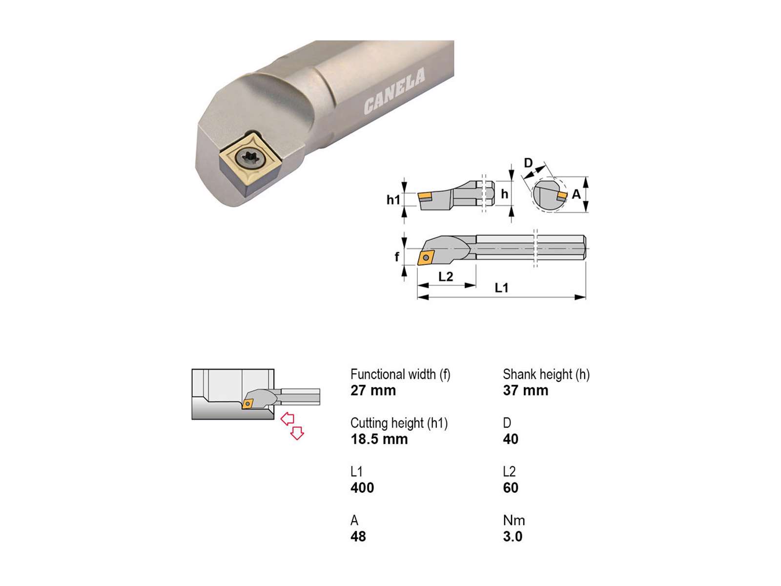 • Canela S40V-SCLCR12 er et robust udborestål med Ø40 mm skaft og 400 mm længde, velegnet til højreindgreb og brug med CC..1204.. skær. Den anvendes primært til intern drejning i stål og andre metaller, hvor høj stabilitet og præcision er påkrævet - også uden køling.