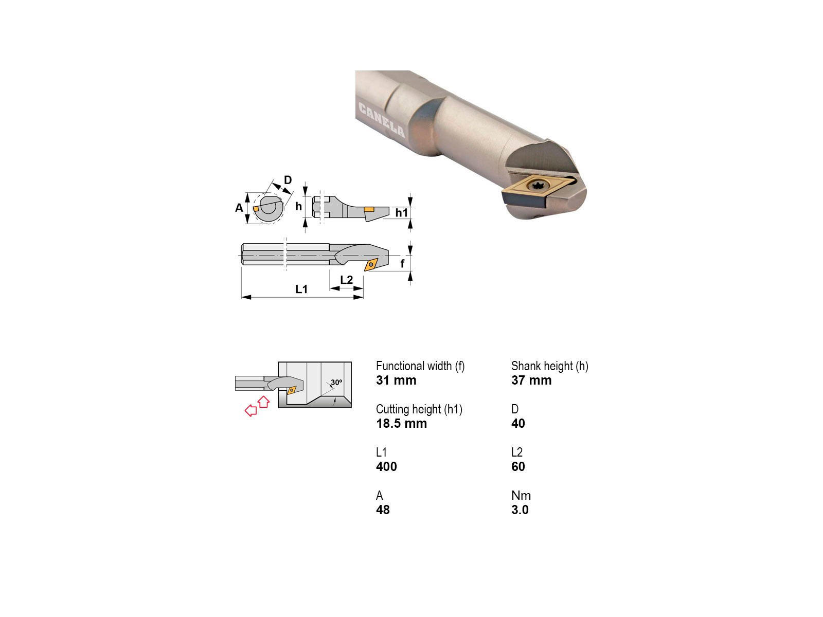 Canela S40V-SDUCL11-EX er et robust udborestål med venstre indgreb og stor skærediameter, velegnet til krævende indvendige drejeopgaver. Udført i høj kvalitet uden indbygget køling og kompatibel med DC..11T3.. platte.