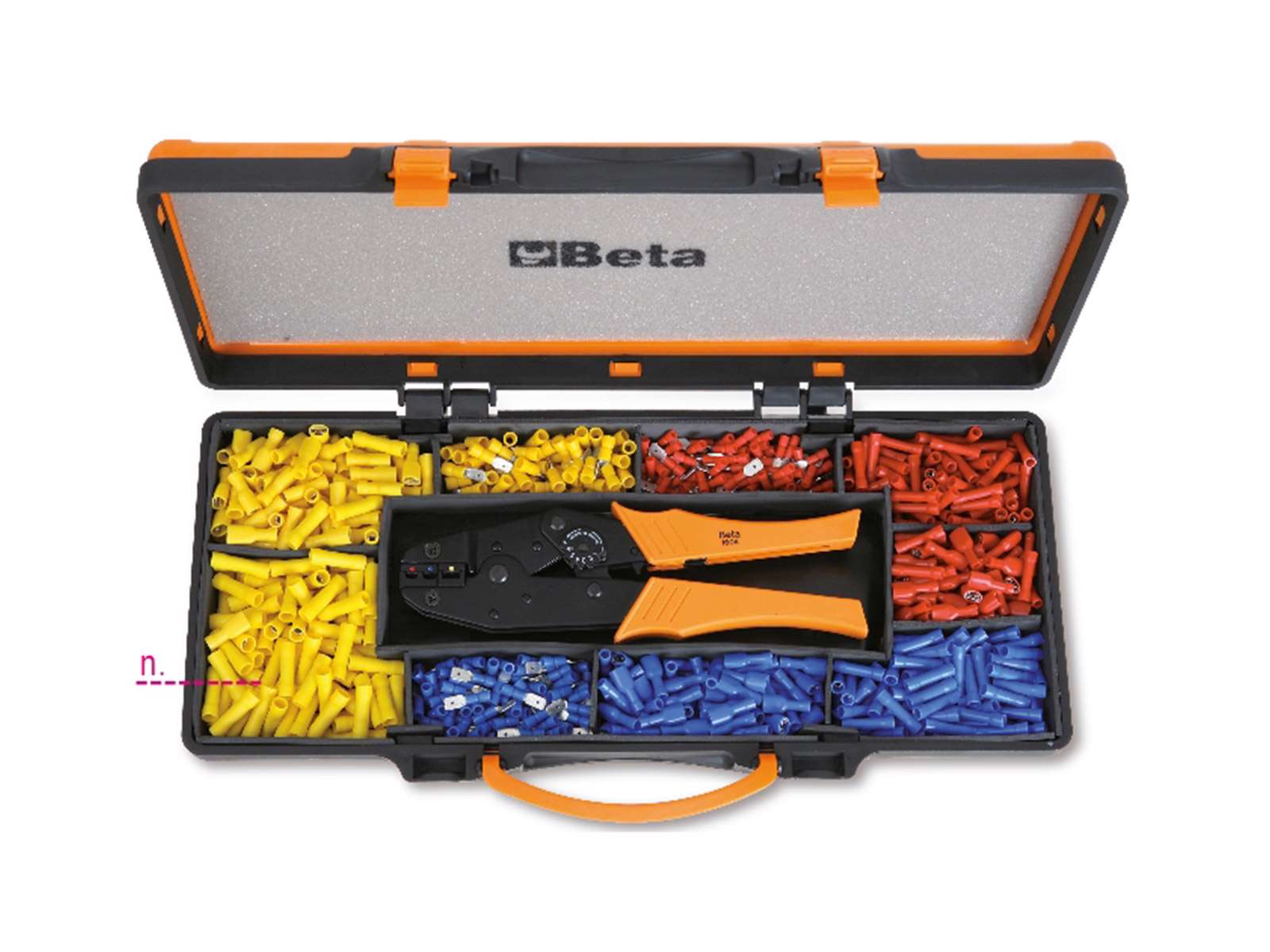 Beta Tools 1608/C9 Kabelskotangsæt. Sættet leveres med 450 terminaler tilpasset en mangfoldighed af ledningsstørrelser, hvilket gør det ideelt til brug i professionelle miljøer, hvor både holdbarhed og præcision er afgørende. Dette sæt er optimalt til brug i både industri- og bilindustrien og tilbyder en omfattende løsning for fagfolk, der søger efter alsidige muligheder for krympning