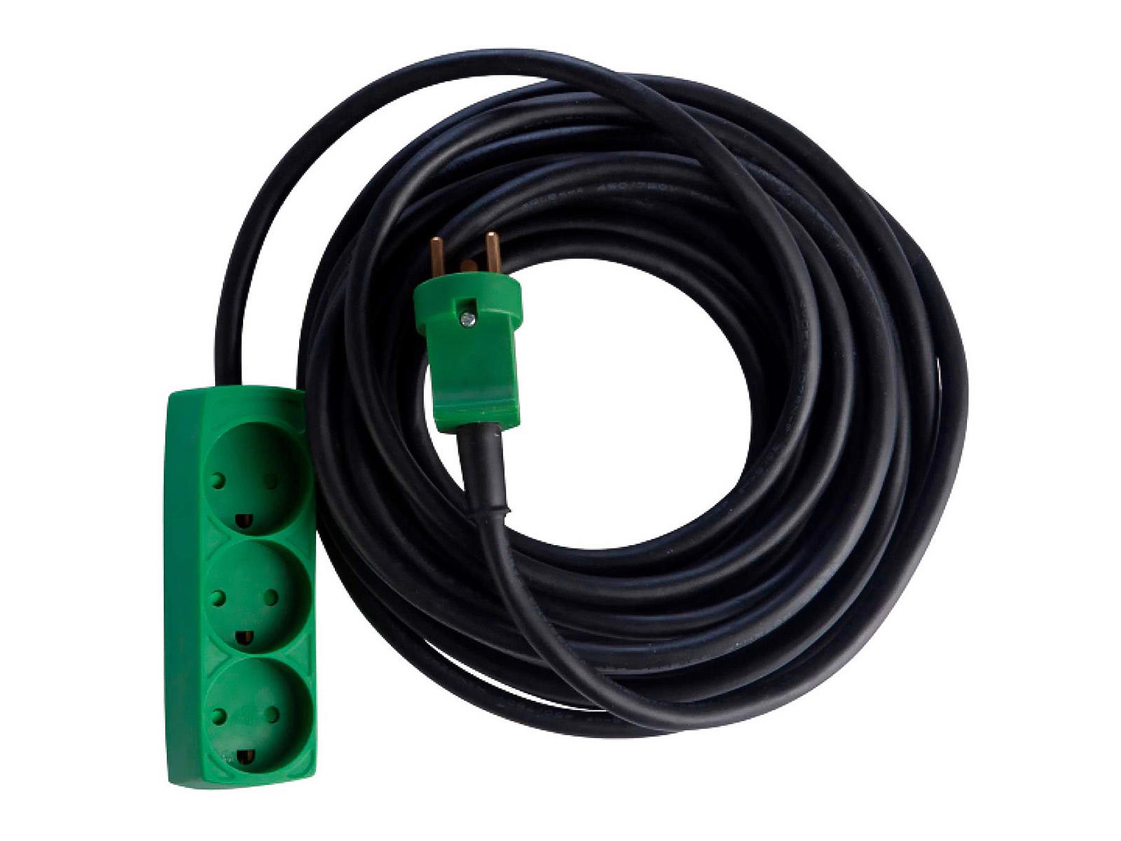 Kabelsæt med DK stikprop og 3-vejs stikdåse med jord for at sikre en professionel og pålidelig strømforsyning. Dette kabelsæt har en længde på 15 meter og er udstyret med 3×1,5 mm² neopren-gummikabel af typen H07RN-F. Dette sikrer en effektiv og sikker strømoverførsel med en spænding på 230 V og en strømstyrke på 16 A, hvilket svarer til en effekt på 3.680 W.