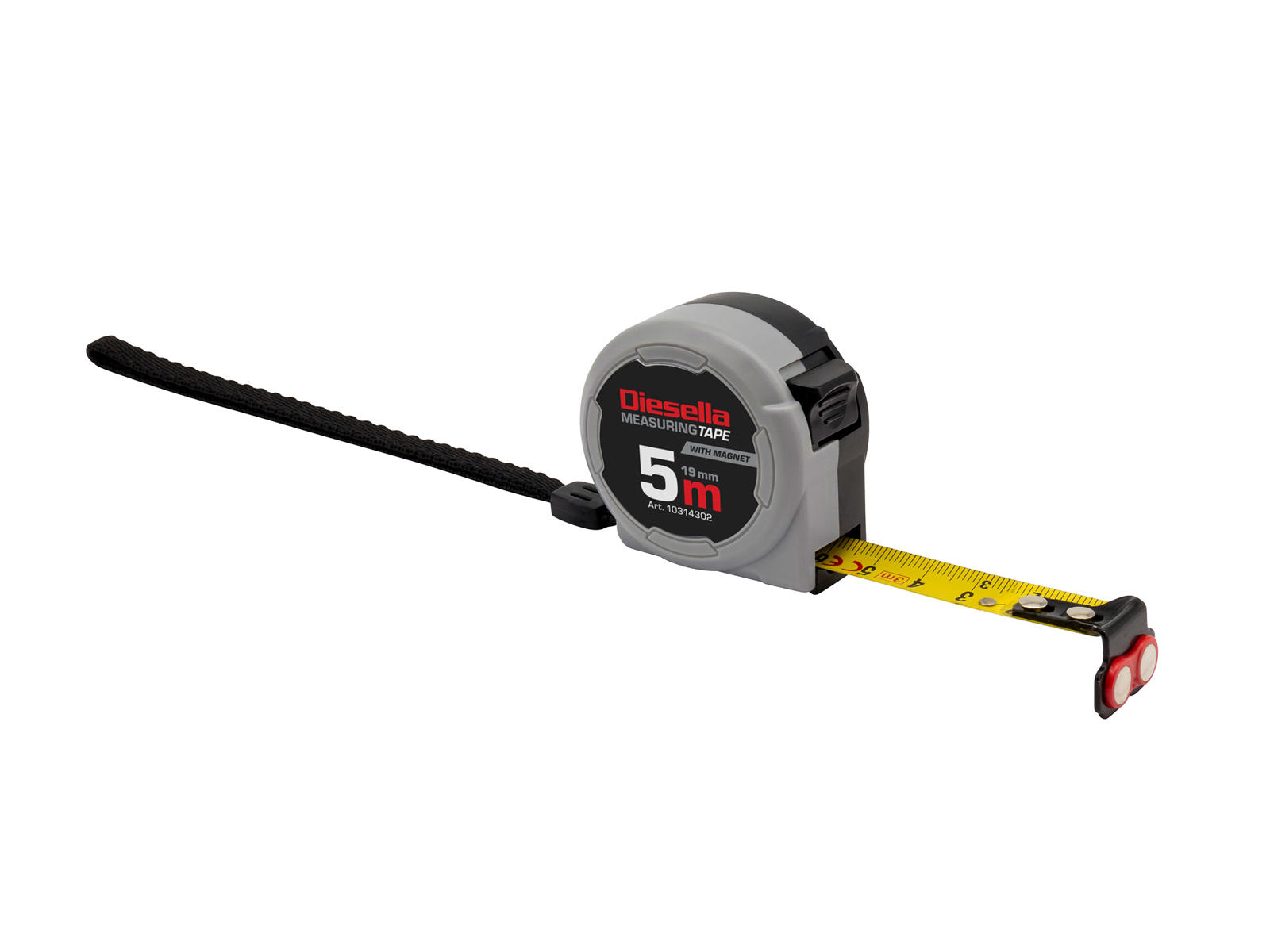 - Båndmålslængde: 5 m med en bredde på 19 mm
