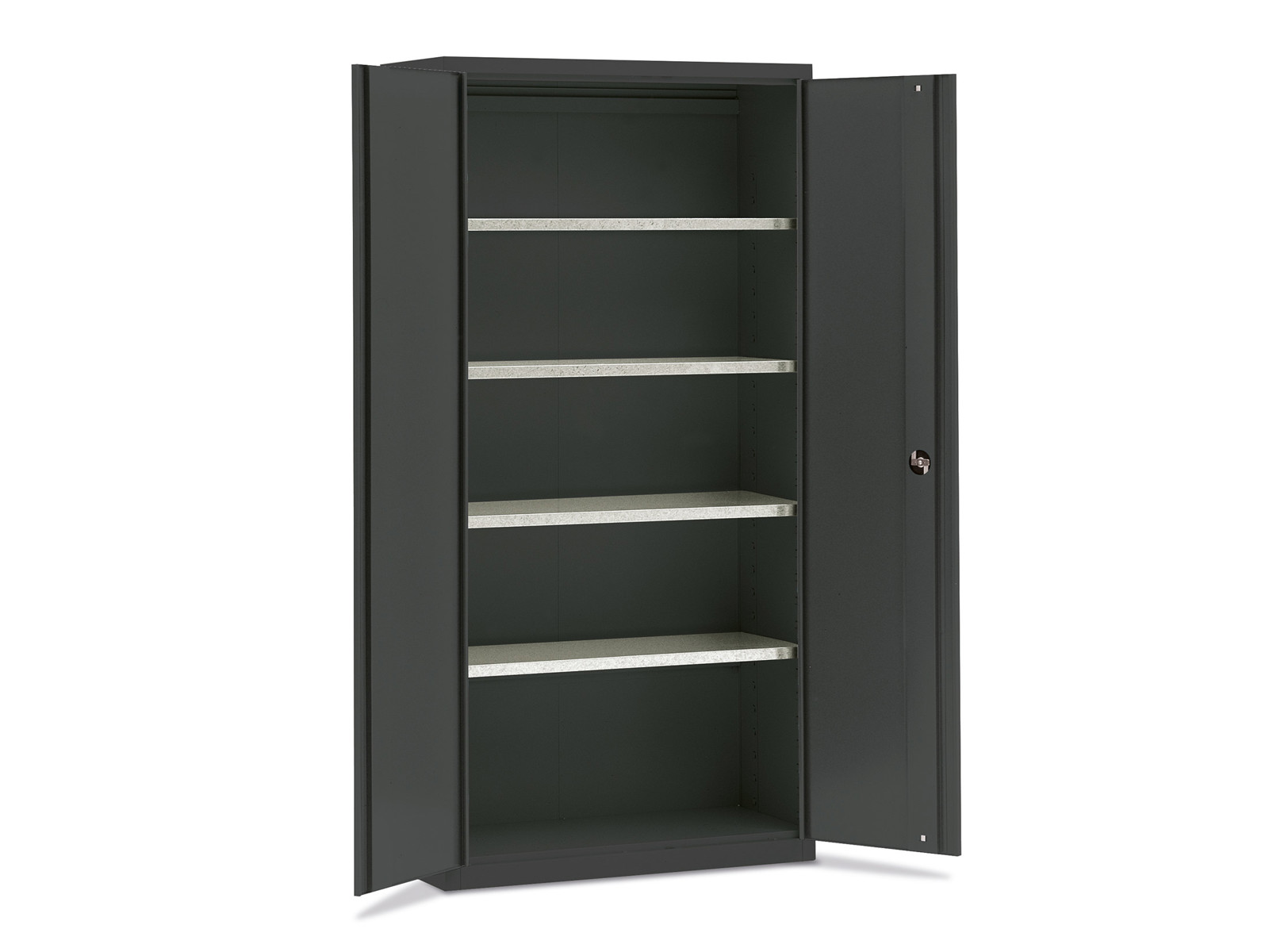 Skabet er lakeret i en stilren antracitgrå farve (RAL 7016), som passer ind i både moderne og industrielle omgivelser. Den robuste konstruktion sikrer lang levetid og stabil opbevaring af både små og store genstande.