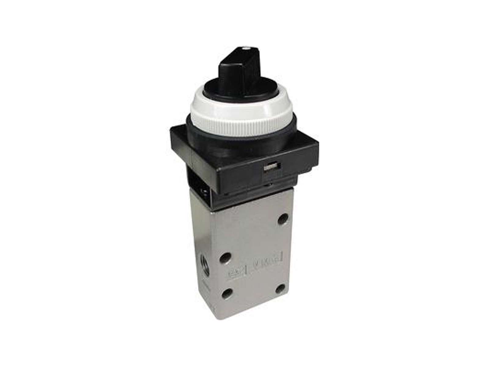 Mekanisk betjent 5/2 ventil med sort drejeknap og intern pilot luft. 5 porte og to positioner.
