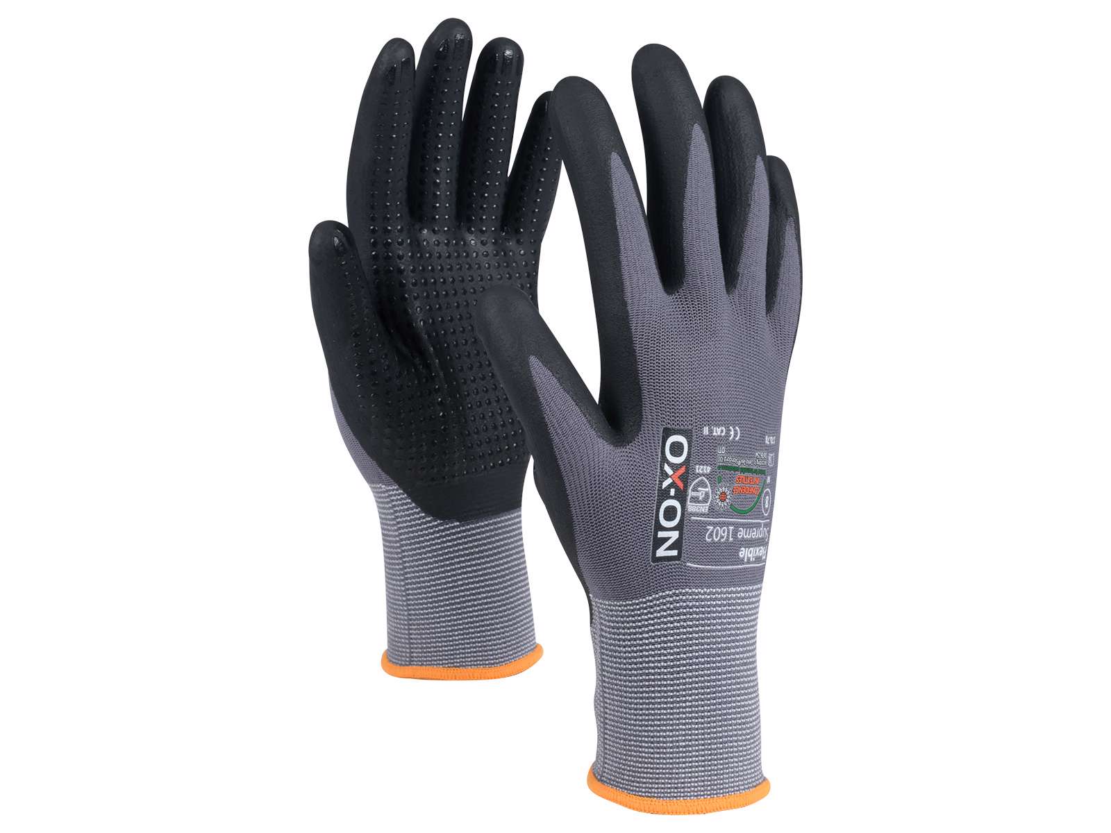 OX-ON Flexible Supreme 1602 er en strikhandske i nylon/elastan med fuld nitril-skum dybning over håndfladen og fingrene. Den er designet til at kombinere præcis fingerføling med effektivt greb, også i både tørre og fugtige omgivelser. Dotter i håndfladen øger grebsfriktionen ved håndtering af glatte komponenter. Handsken er elastisk og smidig, hvilket sikrer komfort og bevægelighed under arbejde med montage, slibning og let industri.