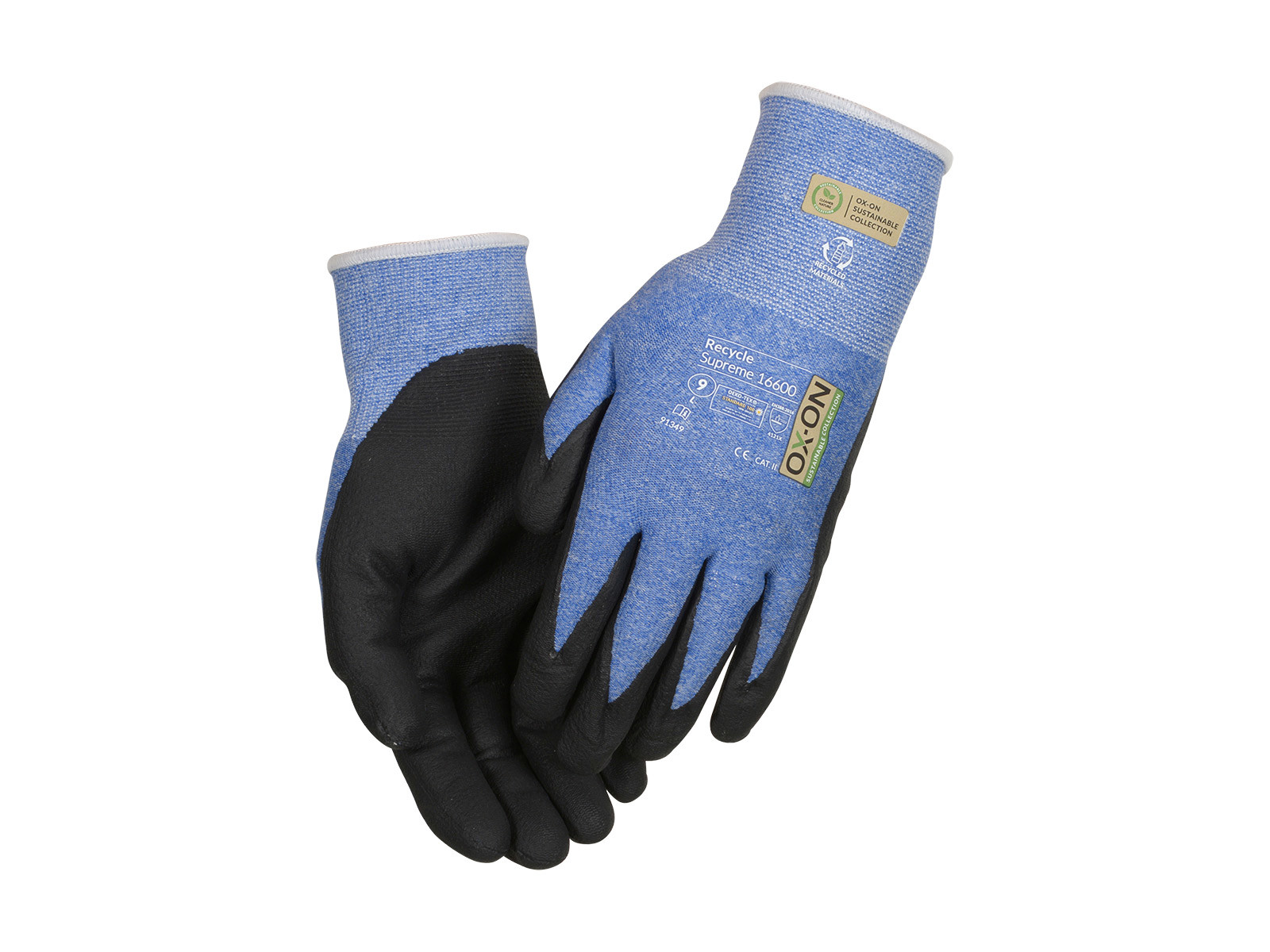 OX-ON Recycle Supreme 16600 tilbyder en enestående, højtydende, allround handske til opgaver, hvor både optimal fingerfølsomhed og effektiv beskyttelse er afgørende. Handsken er konstrueret med 50% genbrugspolyester udvundet fra genbrugte plastflasker og passer perfekt til tømrer-, murer-, slibe-, auto- og montageopgaver.