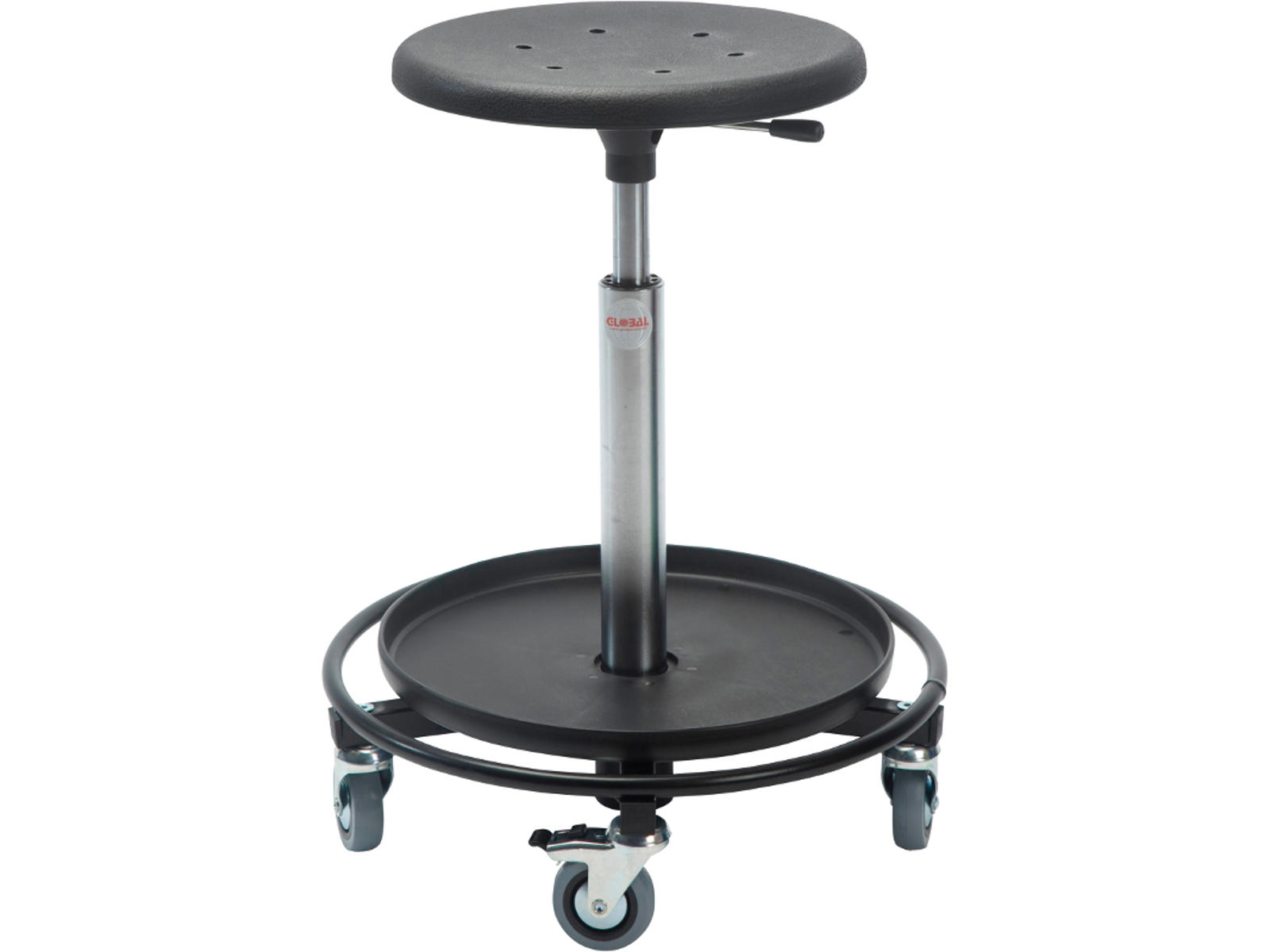 Denne taburet er med 480 mm. stålbase med fodring, værktøjsbakke og med 75 mm. letløbende hjul, hvoraf to har bremse.