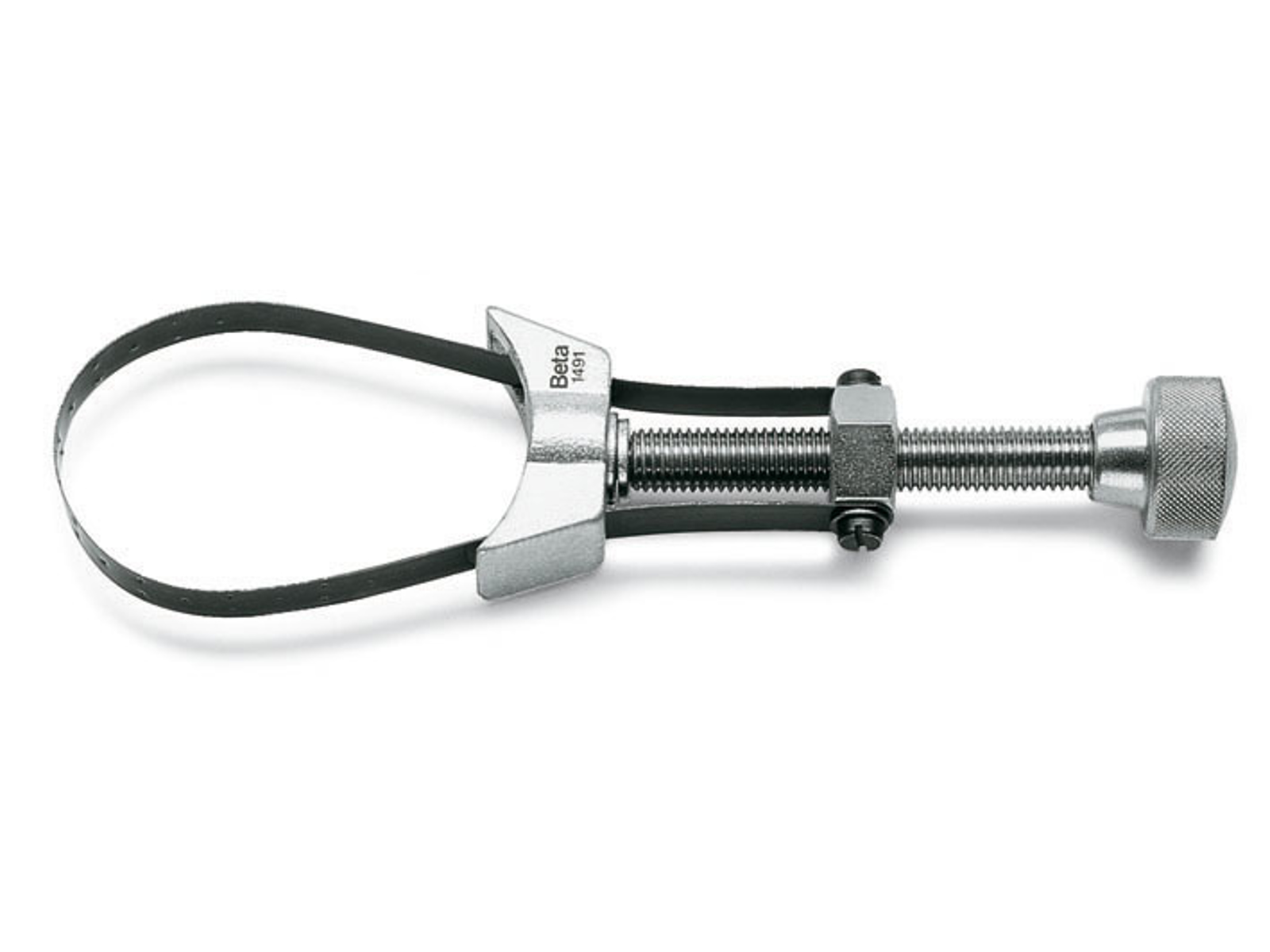 Justerbar oliefiltertang, der er udviklet til at give en effektiv og sikker fjernelse af oliefiltre. Den er udstyret med et stålbånd og en strammeskrue, der garanterer præcision og effektivitet i trange arbejdsområder.