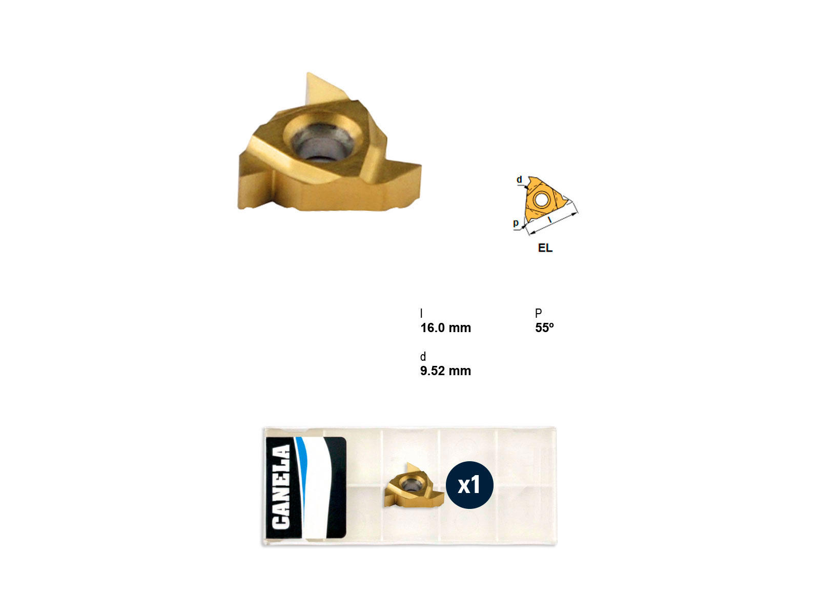 Canela gevindplatte 16EL-AG55 TIN25 er designet til præcisionsarbejde med venstre indgreb. Denne plade er ideel til skæring af gevind med en 55° vinkel og understøtter stigninger mellem 0,5-3,0 mm eller 48-8 TPI. Overfladen er belagt med et slidstærkt TIN25 lag, bestående af TiN-TiC-TiN, der sikrer længere levetid og modstandsdygtighed mod slitage.