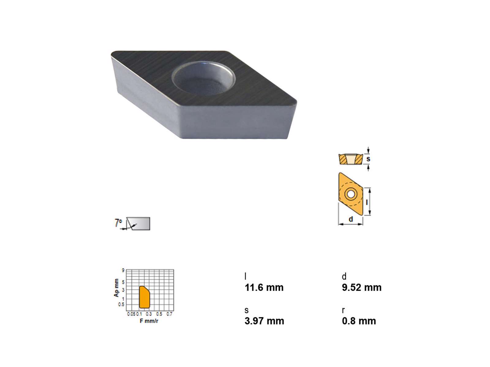 Canela platte DCMW11T308KM15 er en robust skæreegenskab specielt designet til bearbejdning af støbejern. Med en rombeform på 55° og præcis MW-geometri sikrer den nøjagtig præcision i dine bearbejdningsopgaver. Platens specifikationer inkluderer en længde på 11,60 mm, bredde på 9,52 mm og højde på 3,97 mm samt en radius på 0,8 mm. Overfladen er udført i KM15 for øget slidstyrke.