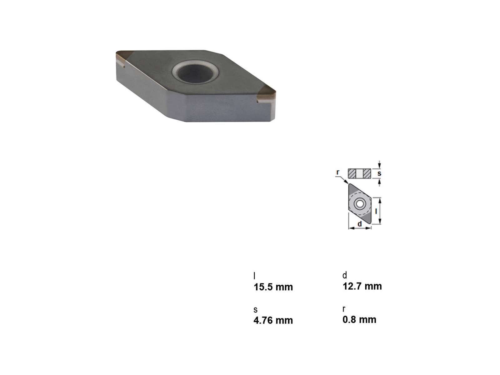 Canela platte DNGA150408CC7 er en rombeformet skæreplade, ideel til bearbejdning af hærdet stål. Dimensioner: 15,50 mm lang, 12,70 mm bred og 4,76 mm høj, med en radius på 0,8 mm og CC7-overflade.