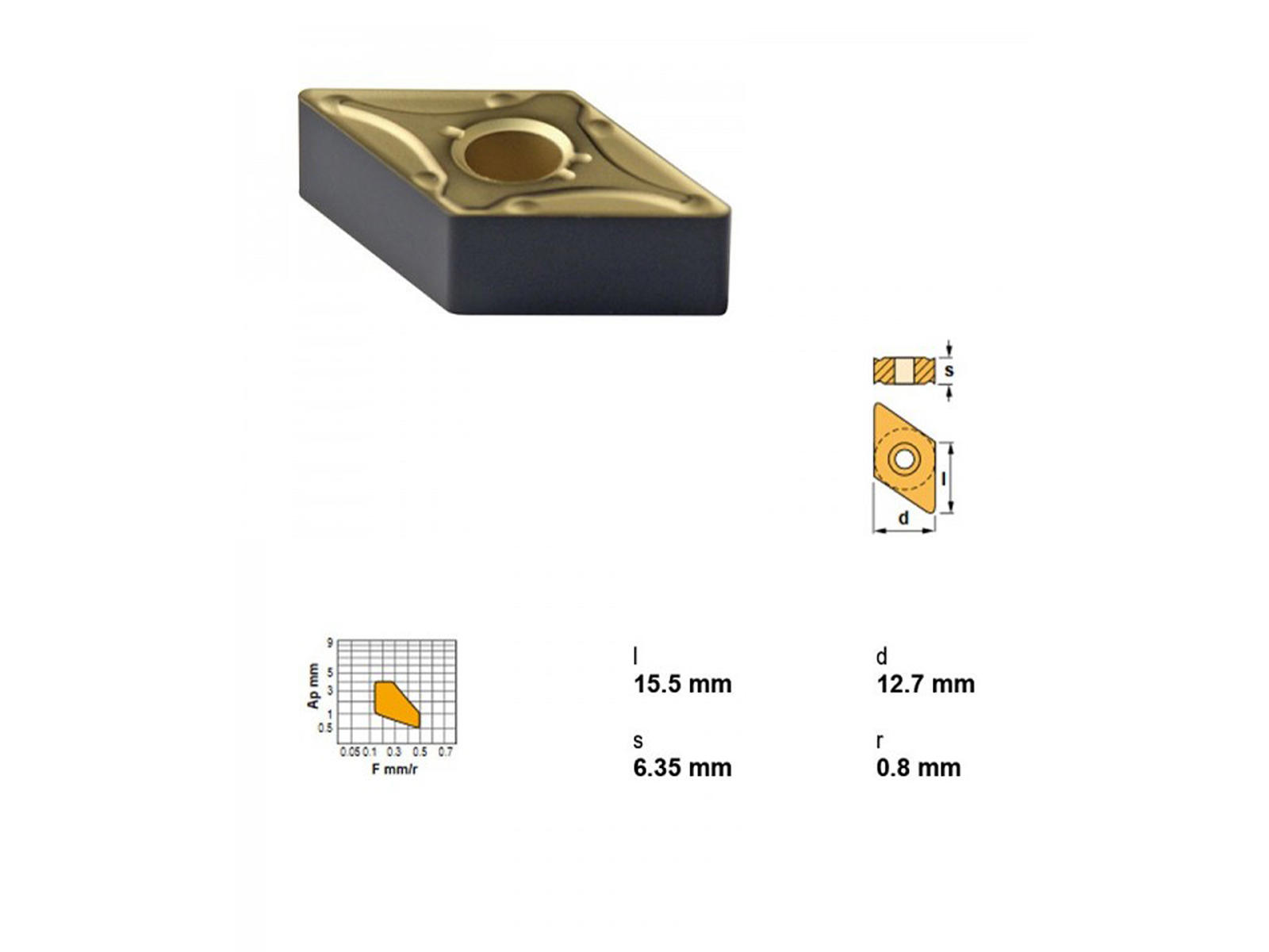 Canela DNMG150608MC-TN30 platte i rombeform (55°) med MC-geometri. Plattens dimensioner er 15,50 mm i længde, 12,70 mm i bredde og 6,35 mm i højde, med en radius på 0,8 mm. Overfladebelægningen TN30 gør den særligt egnet til bearbejdning af stål.