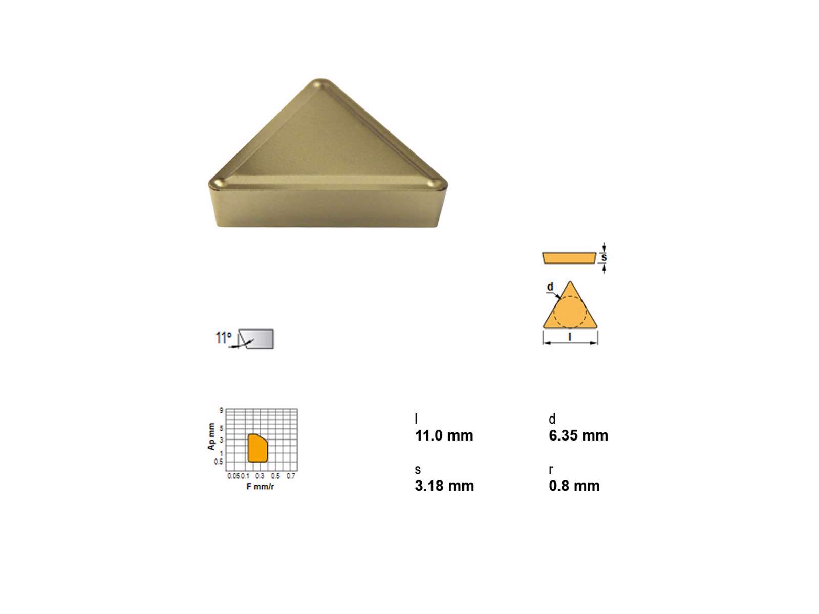 Canela TPMR110308TN20 er en præcisionsskær med trekantet form og MR-geometri, velegnet til drejeopgaver i stål. Den TN20-belagte overflade sikrer høj slidstyrke og termisk stabilitet under krævende bearbejdning.