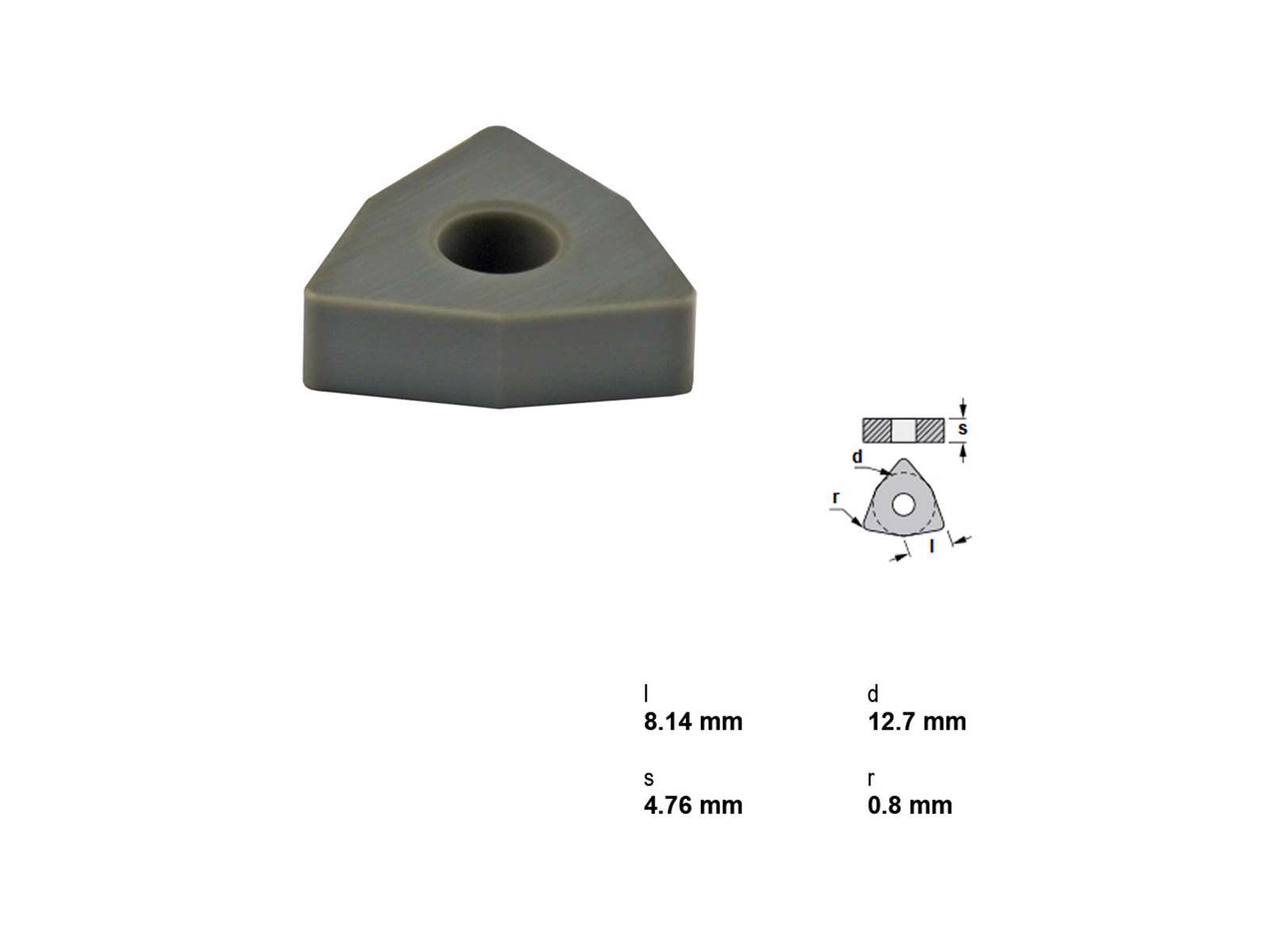 Canela WNGA080408CC7 er en trekantet platte med 8,14 mm skærebredde og 0,8 mm hjørneradius, der sikrer stabil bearbejdning af stål. Den slidstærke CC7-overflade giver forlænget levetid og optimal ydeevne i krævende applikationer.
