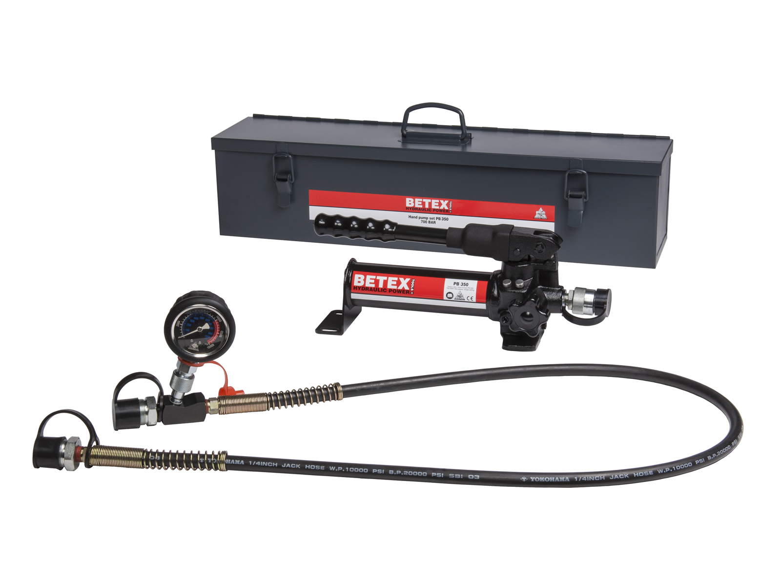 BETEX PB350 er en let og driftssikker 2-trins håndpumpe til service- og montageopgaver. Den svejset stålkonstruktion tåler hårdt brug, og 2-trins udveksling giver hurtig fyldning ved lavt tryk og præcis opbygning af højt tryk. En automatisk aflastningsventil beskytter systemet ved 700 bar. Med kun 5,5 kg og bærehåndtag er PB350 nem at transportere.