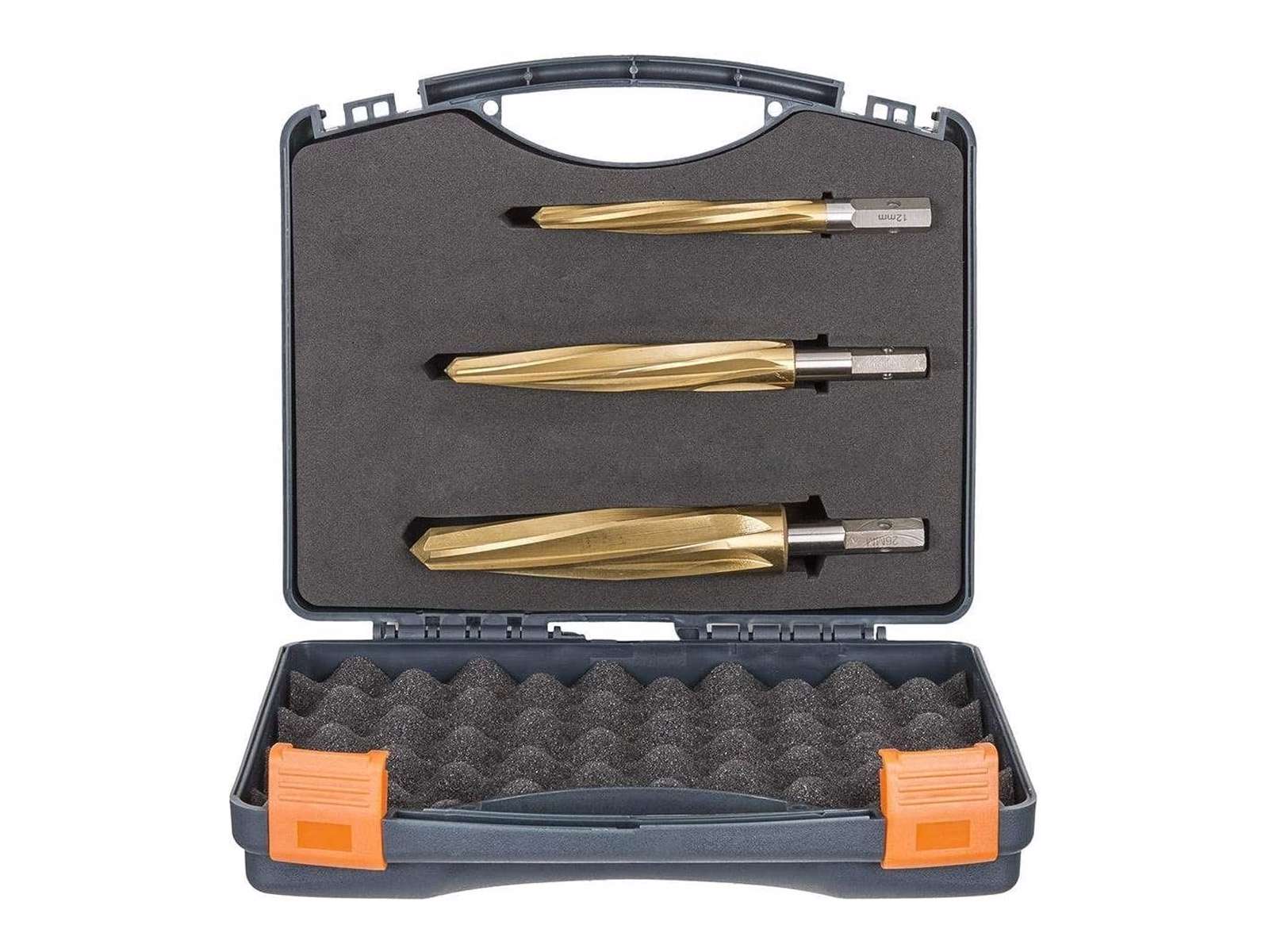 Komplet sæt med tre VersaDrive rømmebor (M14, M18 og M22) til hurtig justering og udvidelse af forborede huller i stål- og montagearbejde. 6-skærs geometri og TiN-belægning giver jævn skæring og lang levetid, og det sekskantede VersaDrive-skaft sikrer skridsikker drift på slagværktøj eller via adapter på magnetboremaskiner.