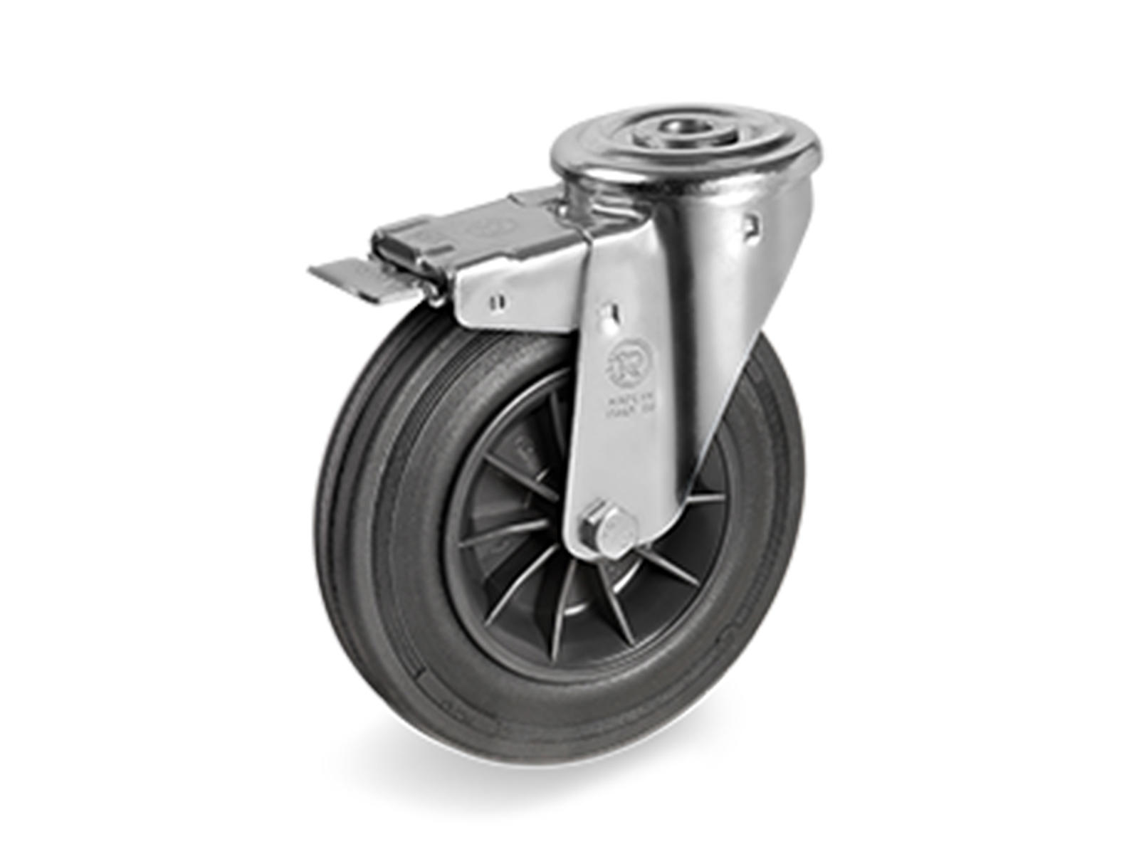 Tellurerota hjul med hulmontering fra Serie 52 er en praktisk løsning til industrielle og kommercielle opgaver. Hjulet har en polypropylen kerne, der giver styrke, og en gummibane med en hårdhed på 80 Shore A for god trækkraft og holdbarhed. Konstruktionen er velegnet til at håndtere daglig brug under krævende forhold.