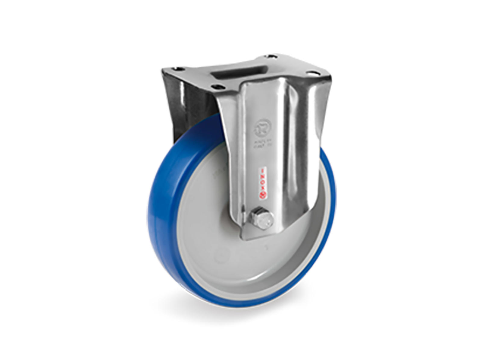 Hjulet er udstyret med et glideleje, som er placeret i et hul i materialet og holder akslen på plads. Det fastmonterede beslag af type NLX er lavet af AISI 304 rustfrit stål, som er kendt for sin høje korrosionsbestandighed og lang levetid, selv under barske forhold.