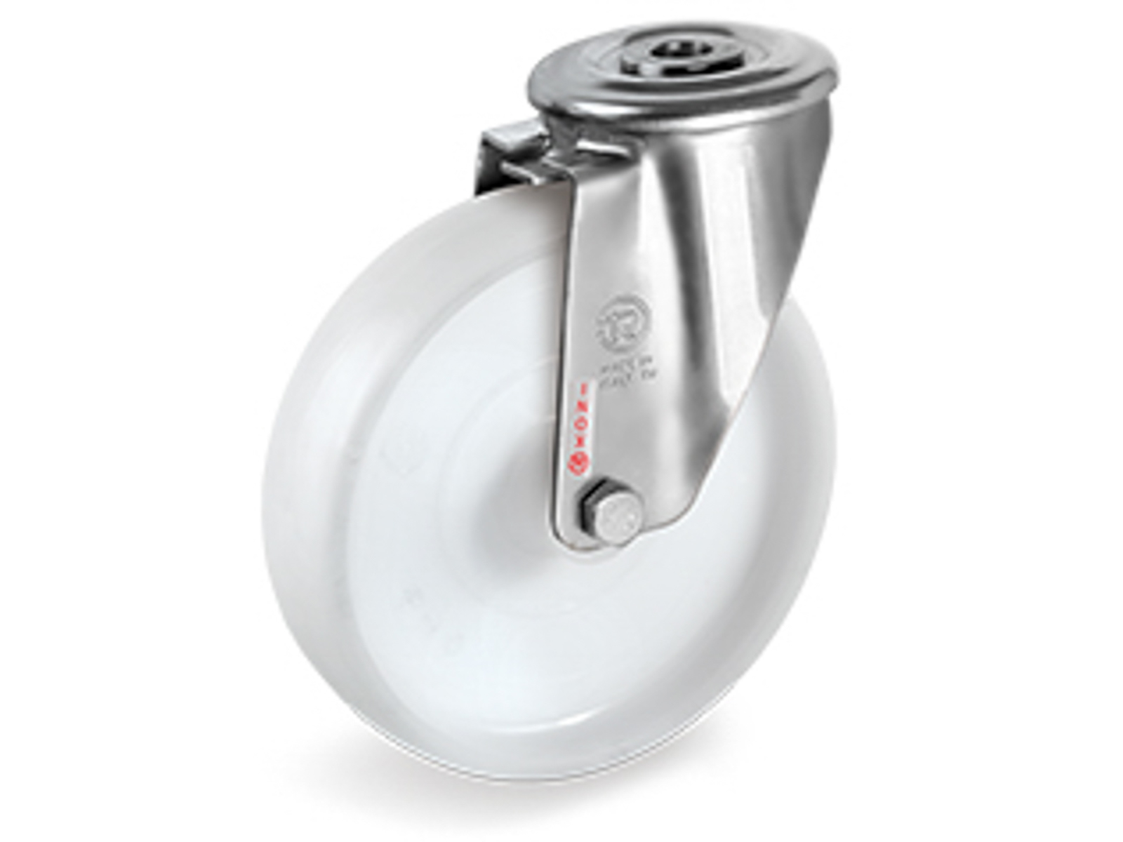 Hjulet er lavet af polyamid 6 og er udstyret med et rustfrit rulleleje, som giver stabil rotation og kræver minimal vedligeholdelse.