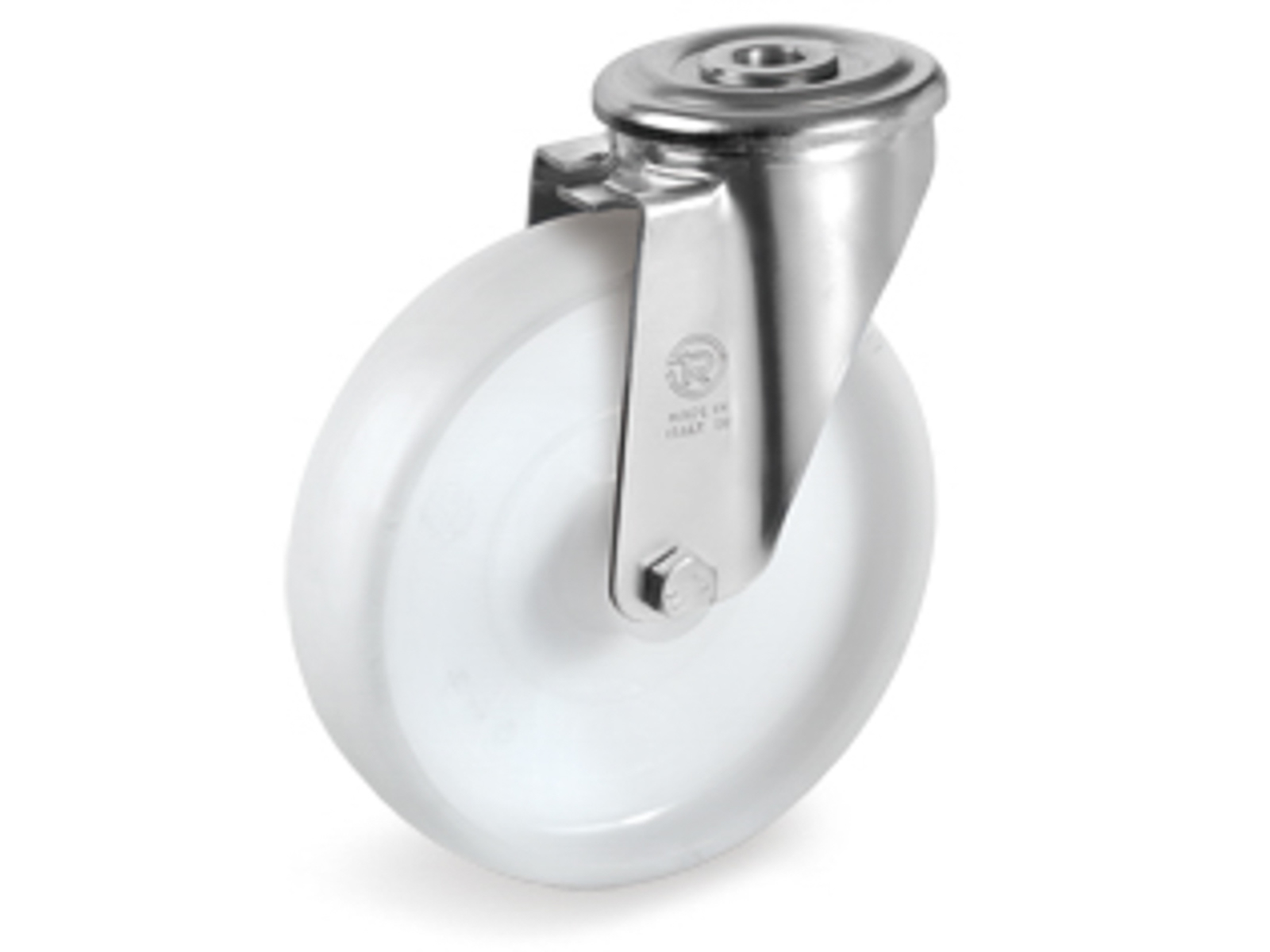 Tellurerota hjulet med hulmontering er lavet af polyamid 6 og har glideleje, der giver en stabil og jævn rotation. Hjulet er velegnet til brug i industrielle miljøer, hvor der kræves pålidelig funktion og holdbarhed. Den drejelige monteringsplade sikrer enkel installation og stabil drift.