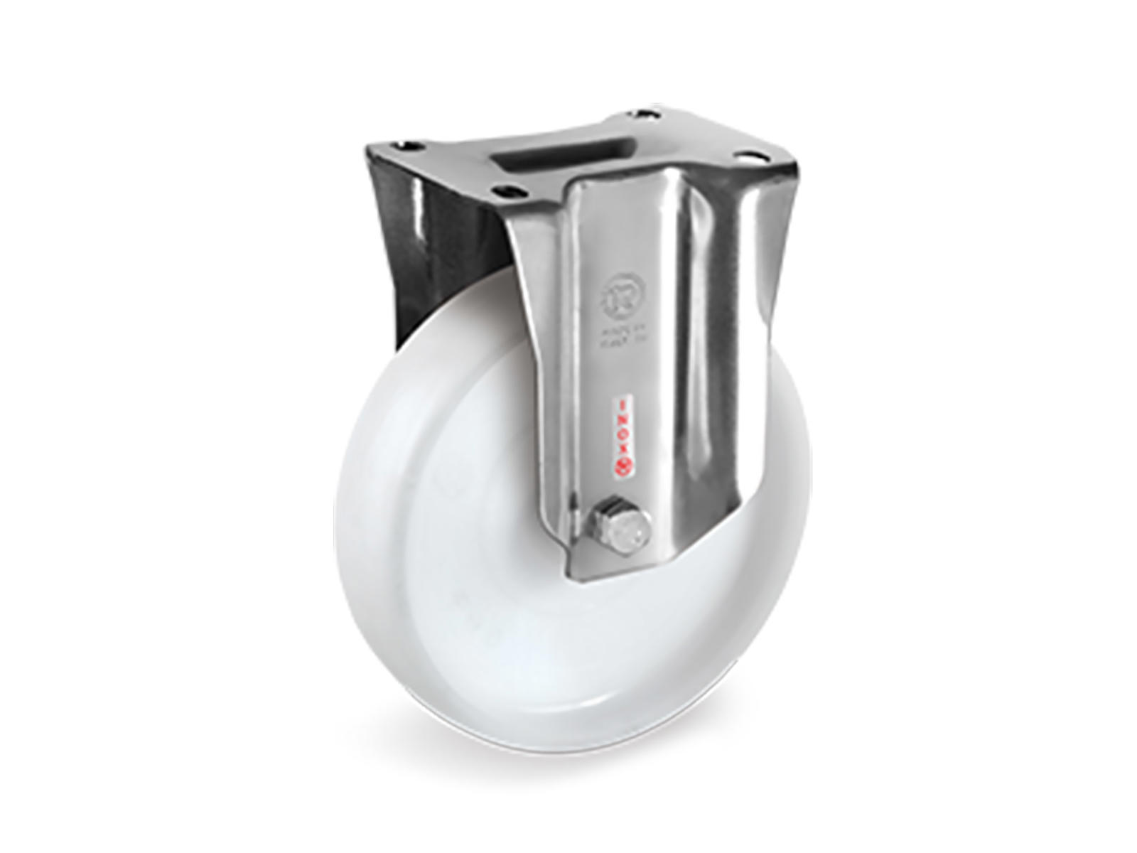 Beslaget er af typen NLX og lavet af rustfrit stål (AISI 304), hvilket beskytter mod rust og slid. Det gør hjulet velegnet til miljøer med høj luftfugtighed eller andre krævende forhold.