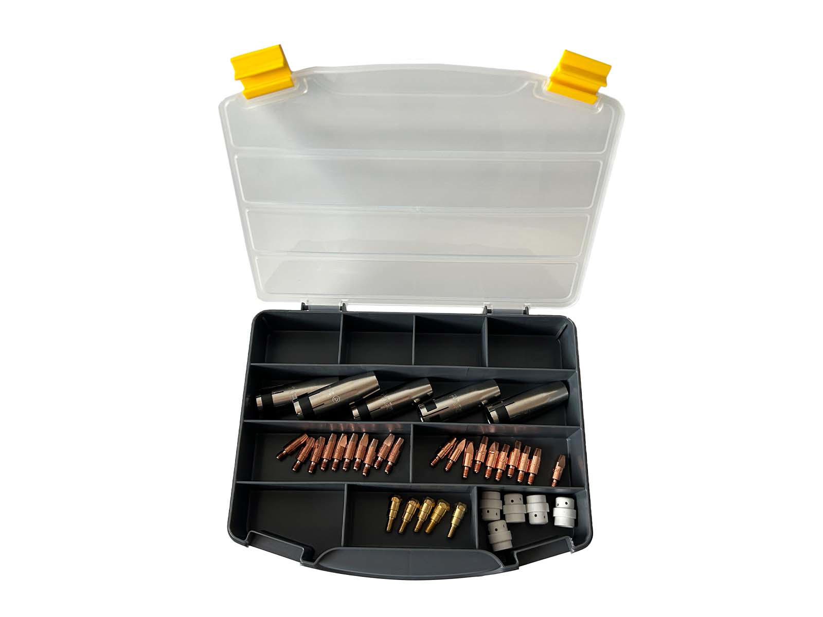 - Indhold (uddrag): Sortimentsboks med faste rum (1 stk.); koniske gaskopper SGB240A/W (5 stk.); gasfordelere SGB240A/W hvid (5 stk.); dysestokke SGB240A/W (5 stk.); kontaktdyser M6×28 E-Cu 0,8 mm (10 stk.) og 1,0 mm (10 stk.).