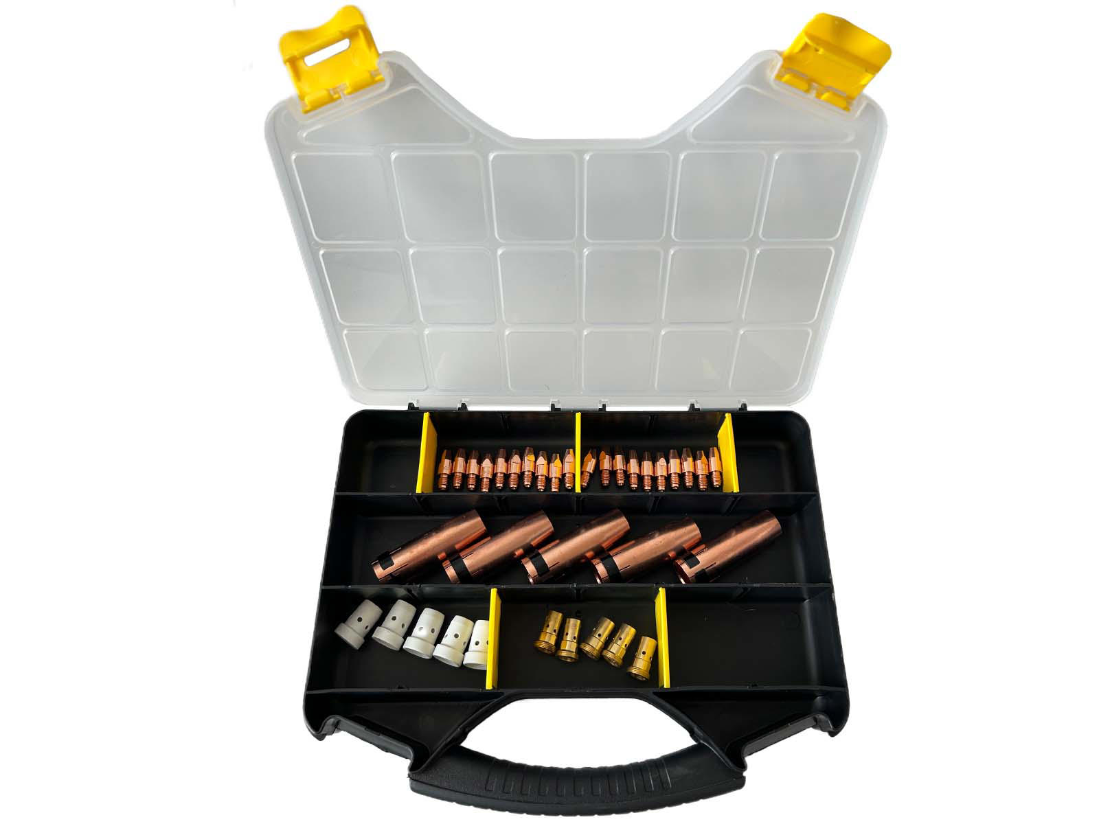 Komplet sliddelekasse til Parker Torchology SGB401W/501W og kompatible systemer. Sættet samler de mest brugte frontdele, så udskiftning kan ske hurtigt ved driftstop og planlagt vedligehold. Se MIG/MAG sortimentsbokse for flere sæt.