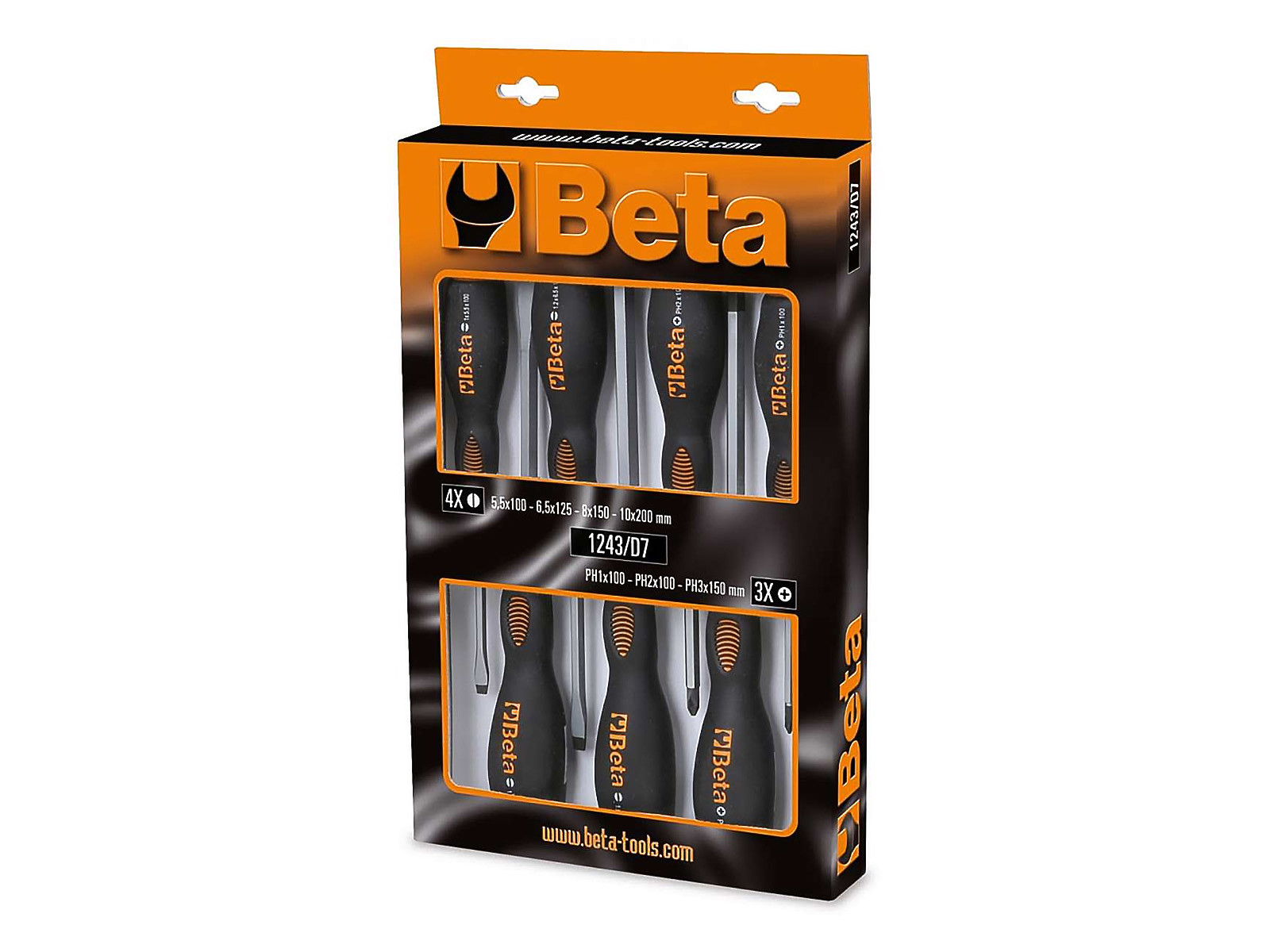Beta Tools 1243/D7 er et alsidigt og robust skruetrækkersæt, lavet til både ligekærv og Phillips-skruer. Skruetrækkerne i dette sæt er udstyret med slagkappe, der strækker sig gennem det støbte plasthåndtag. I enden af håndtaget er slagkappene udformet til en rund hætte, som kan modstå slag fra en hammer uden at beskadige håndtaget.