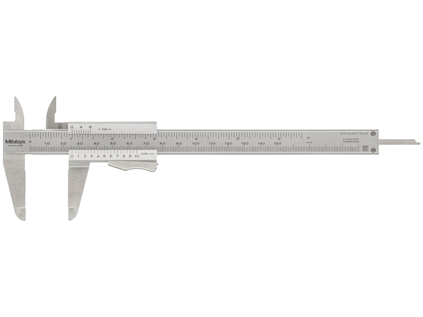 Skydelære med tommelfingerklemme bevæger sig kun, når du trykker på det fjederbelastede tommelfingergreb. Konstruktion af hærdet rustfrit stål med letlæselige, satinforkromede skalaer