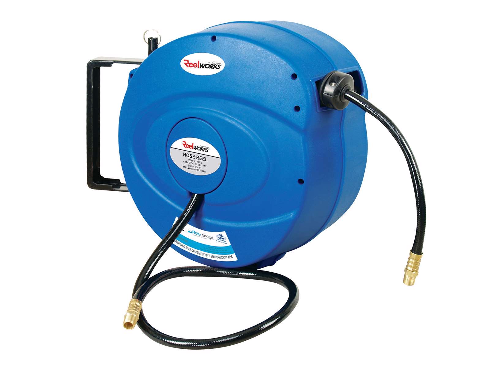 • Boks i slagfast polypropylene med drejeligt væg-/loftbeslag. Låser automatisk slangen ved ønsket længde