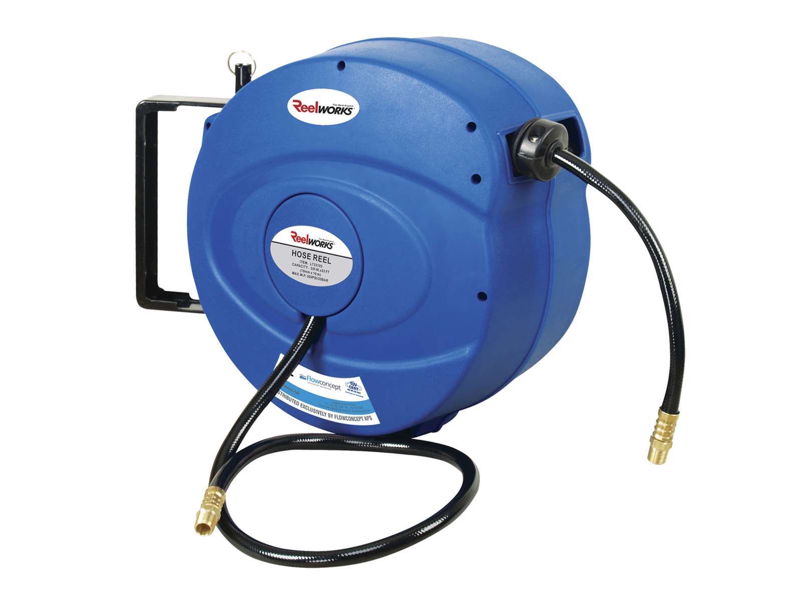 • Boks i slagfast polypropylene med drejeligt væg-/loftbeslag. Låser automatisk slangen ved ønsket længde