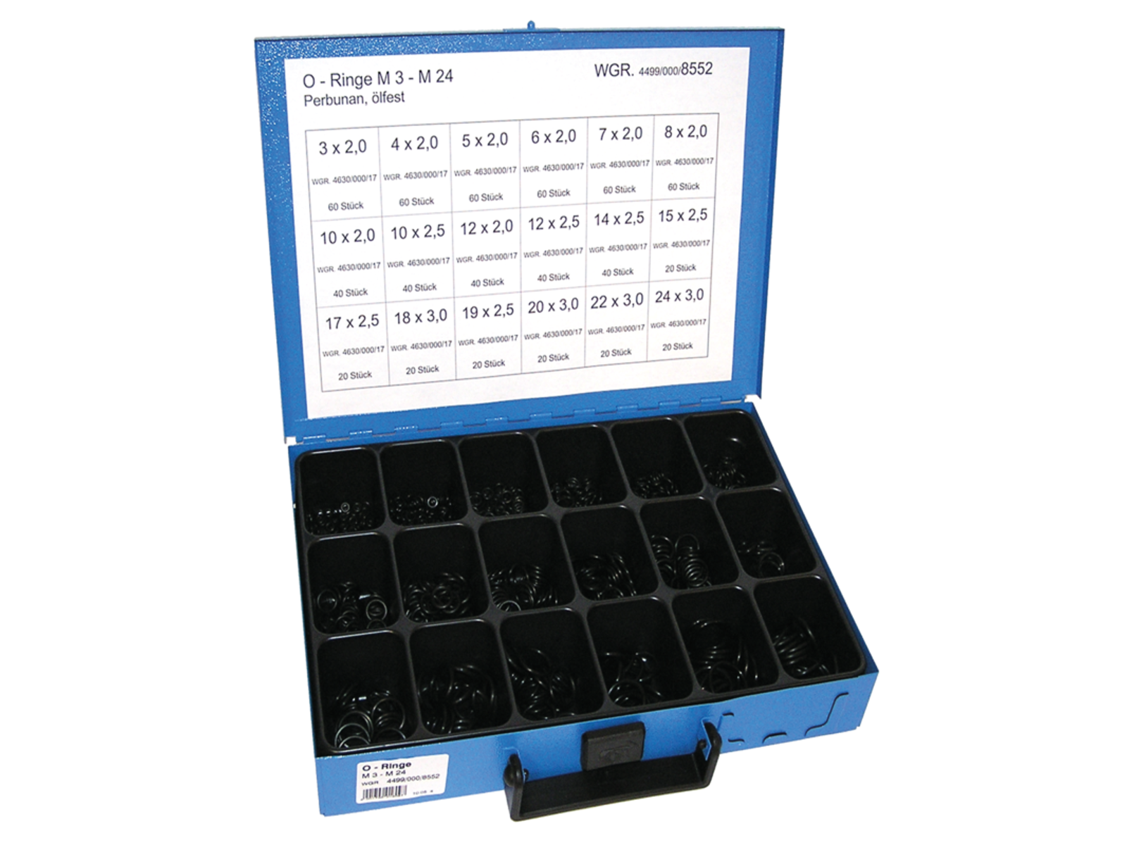 Dette O-ringssortiment fra Dresselhaus indeholder i alt 700 O-ringe i 18 størrelser, fremstillet i sort olie- og trykbestandig Perbunan (NBR). Sortimentet leveres i en robust metalkuffert med overskuelig inddeling, og anvendes bredt til tætning i hydrauliske, pneumatiske og mekaniske samlinger. Pakningernes præcise dimensioner og modstandsdygtighed gør sættet velegnet til både vedligeholdelse og montageopgaver i industri og værksted.