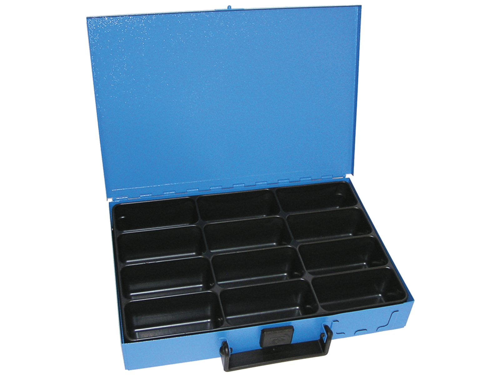- Farve: Blå metalkasse med sorte indsatsbakker
